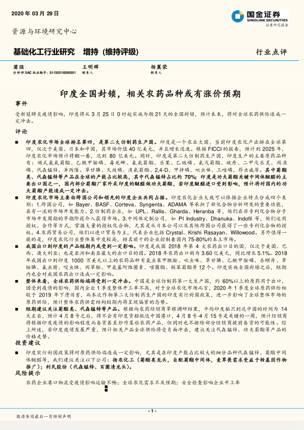 基础化工行业研究:印度全国封锁,相关农药品种或有涨价预期