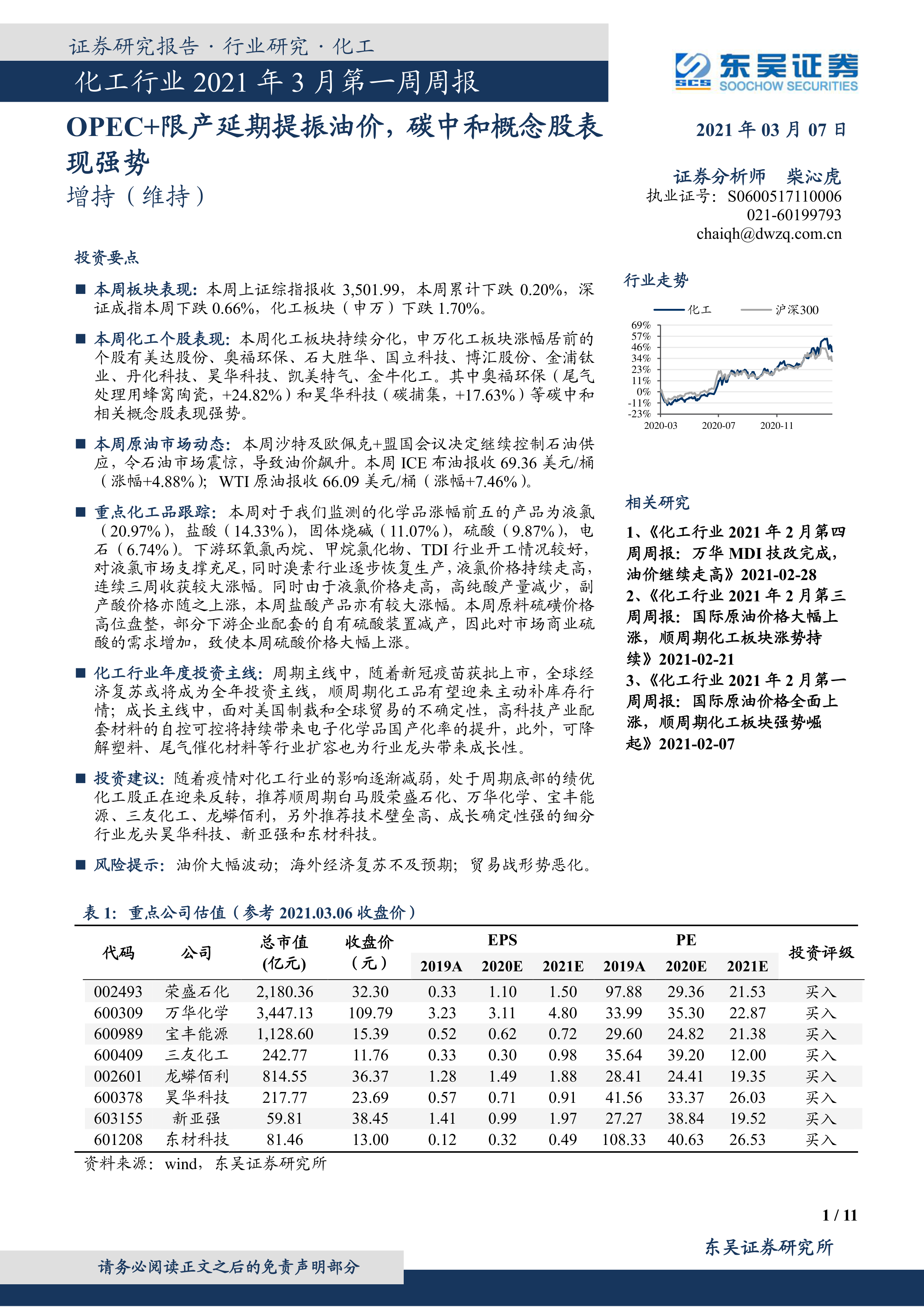 化工行业2021年3月第一周周报:OPEC+限产延期提振油价,碳中和概念股表现强势