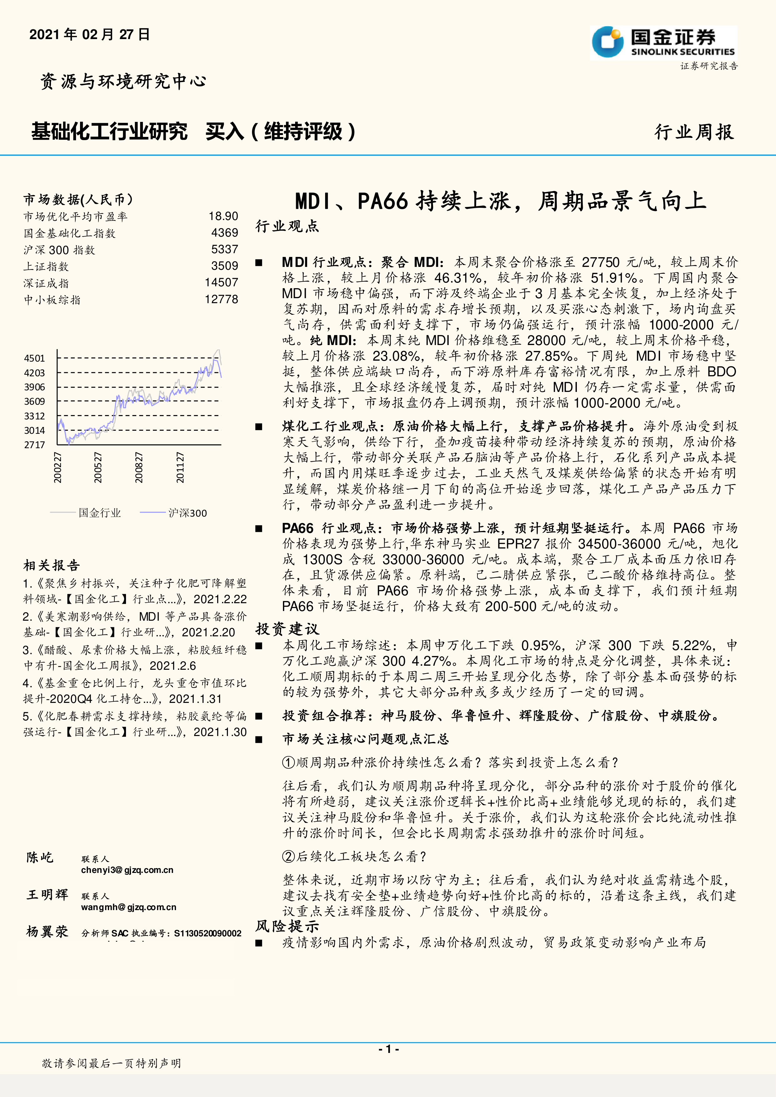M DI 行业观点:聚合 MDI:本周末聚合价格涨至 27750 元/吨,较上周末价格上涨,较上月价格涨 46.31%,较年初价格涨 51.91%。下周国内聚合MDI 市场稳中偏强,而下游及终端企业于 3 月基本完全恢复,加上经济处于复苏期,因而对原料的需求存增长预期,以及买涨心态刺激下,场内询盘买气尚存,供需面利好支撑下,市场仍偏强运行,预计涨幅 1000- 2000 元/吨。纯 MDI:本周末纯 MDI 价格维稳至 28000 元/吨,较上周末价格平稳,较上月价格涨 23.08%,较年初价格涨 27.85%。下周纯 MDI 市场稳中坚挺,整体供应端缺口尚存,而下游原料库存富裕情况有限,加上原料 BDO大幅推涨,且全球经济缓慢复苏,届时对纯 MDI 仍存一定需求量,供需面利好支撑下,市场报盘仍存上调预期,预计涨幅 1000-2000 元/吨。