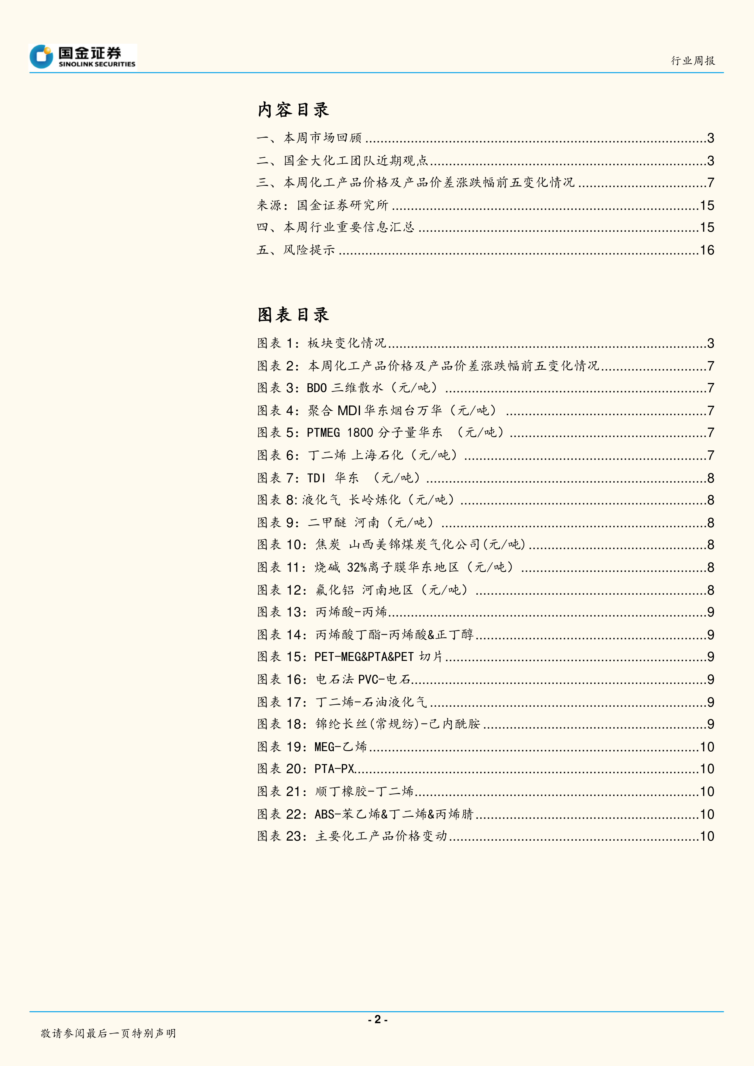 本报告主要从市场回顾、国金大化工团队近期观点、化工产品价格及产品价差变化、行业重要信息以及风险提示五个方面展开分析。