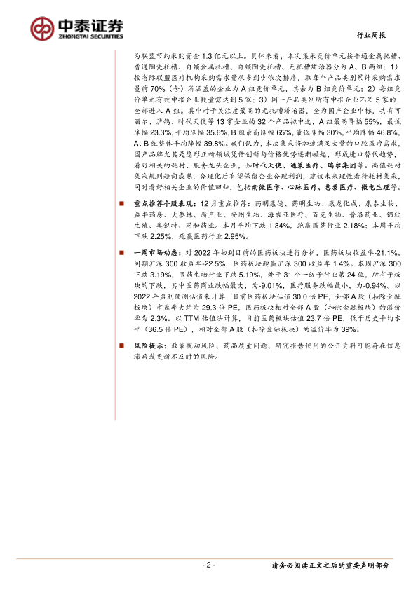 口腔正畸托槽耗材集采开标,降幅相对温和,相关耗材、服务龙头有望受益进口替代。12月19日,陕西省公共资源交易中心发布《省际联盟(区、兵团)正畸材料托槽类耗材集中带量采购拟中选结果》。本次为陕西省医保局牵头的陕西、山西、内蒙古、辽宁等16省(自治区、兵团)联盟口腔正畸托槽耗材集采,32家企业的572个产品拟中选,拟中选产品价格平均降幅43.23%,最高降幅88%,预计每年可为联盟节约采购资金1.3亿元以上。具体来看,本次集采竞价单元按普通金属托槽、普通陶瓷托槽、自锁金属托槽、自锁陶瓷托槽、无托槽矫治器分为A、B两组:1)按省际联盟医疗机构采购需求量从多到少依次排序,取每个产品类别累计采购需求量前70%(含)所涵盖的企业为A组竞价单元,其余为B组竞价单元;2)每组竞价单元有效申报企业数量需达到5家;3)同一产品类别所有申报企业不足5家的,全部进入A组。其中对于关注度最高的无托槽矫治器,全为国产企业中标,共有可丽尔、泸鸽、时代天使等13家企业的32个产品拟中选,A组最高降幅55%,最低降幅23.3%,平均降幅35.6%,B组最高降幅65%,最低降幅30%,平均降幅46.8%,A、B组整体平均降幅39.8%。我们认为,本次集采将加速满足大量的口腔医疗需求,国产品牌尤其是隐形正畸领域凭借创新与价格优势逐渐崛起,形成进口替代趋势,看好相关的耗材、服务龙头企业,如时代天使、通策医疗、瑞尔集团等。高值耗材集采规则趋向成熟,合理化后有望保留企业合理利润,建议未来理性看待耗材集采,同时看好相关企业的价值回归,包括南微医学、心脉医疗、惠泰医疗、微电生理等。