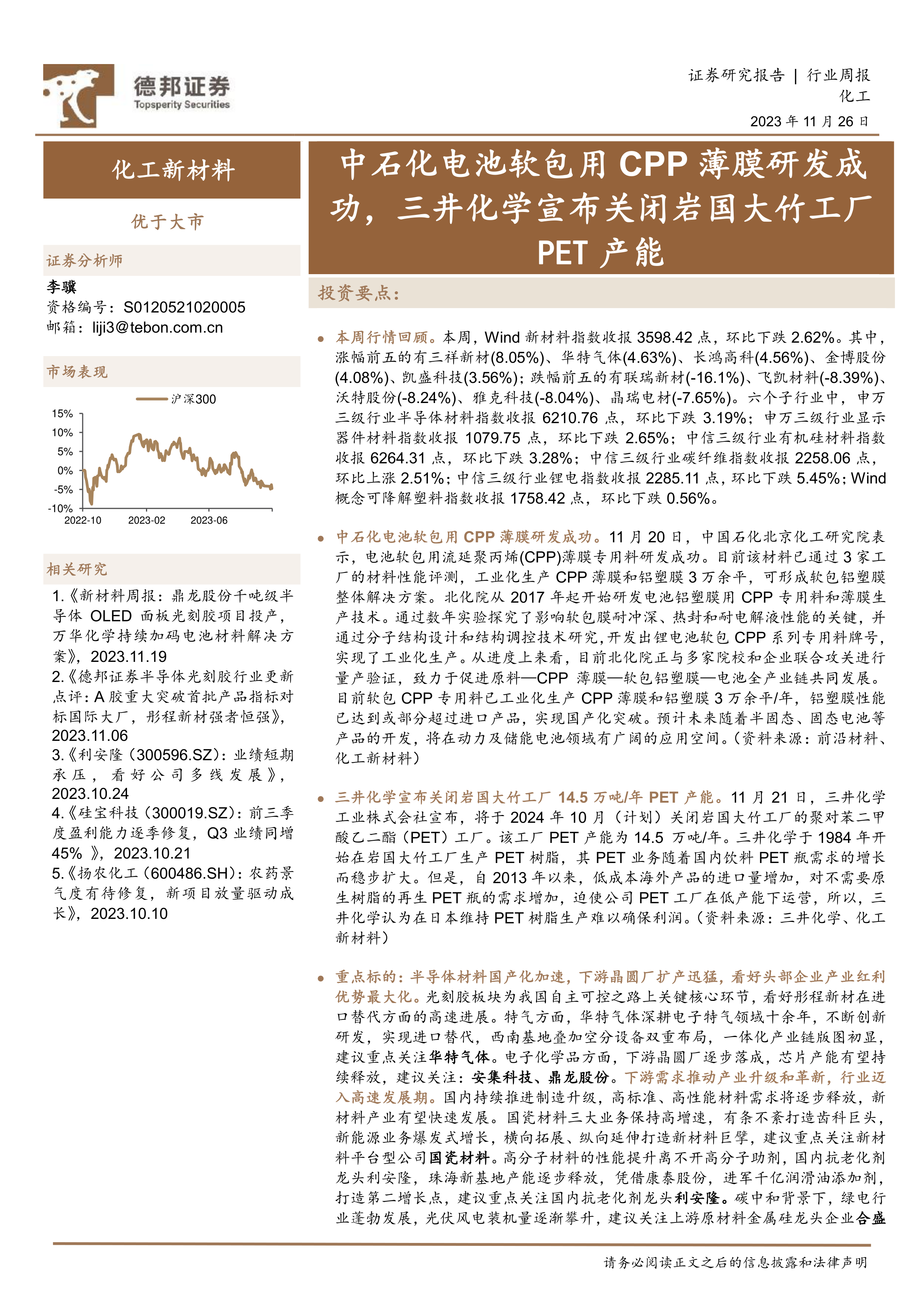 化工新材料行业周报:中石化电池软包用CPP薄膜研发成功,三井化学宣布关闭岩国大竹工厂PET产能