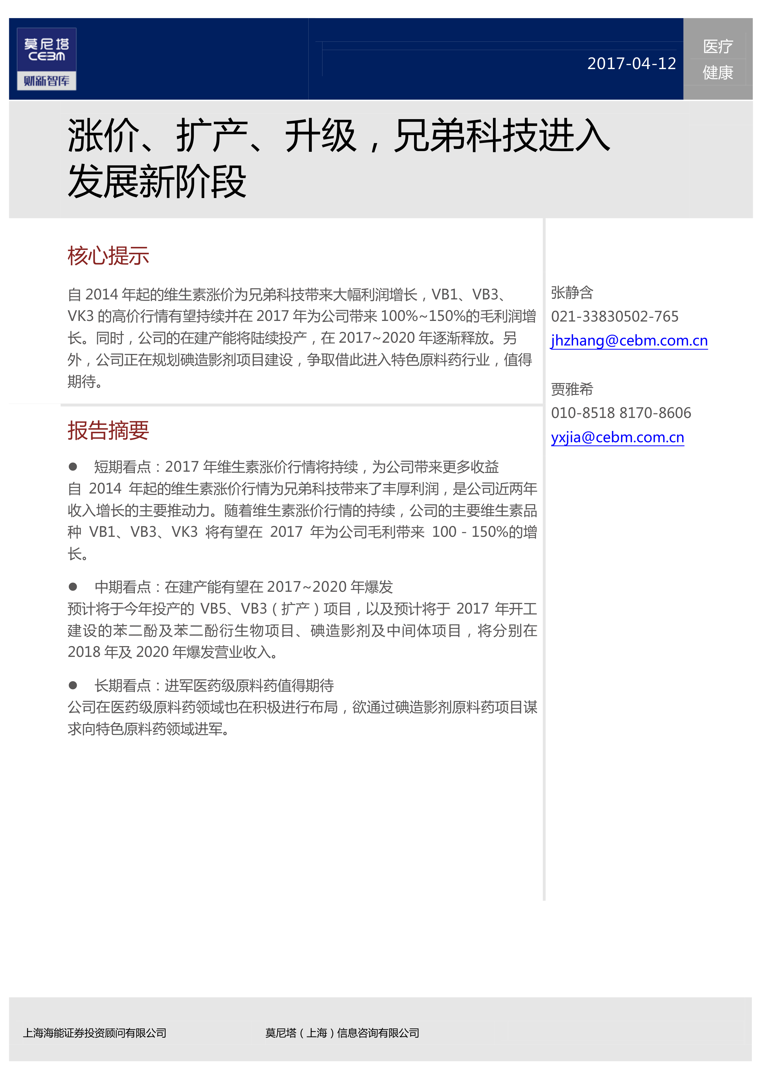 本报告对兄弟科技公司在2017年的发展前景进行了分析,认为公司正受益于维生素涨价行情和在建产能的陆续投产。短期内,维生素价格上涨将持续为公司带来高额利润;中期来看,新产能的释放将进一步提升公司营收规模;长期目标是进军医药级特色原料药领域,提升公司在医药行业中的竞争地位。 报告通过数据和图表,对公司财务状况、市场环境以及发展战略进行了全面的分析,为投资者提供了有价值的参考信息。 然而,报告也应注意到,维生素价格波动以及医药行业政策变化等不确定因素,可能对公司未来发展造成影响,需要持续关注。