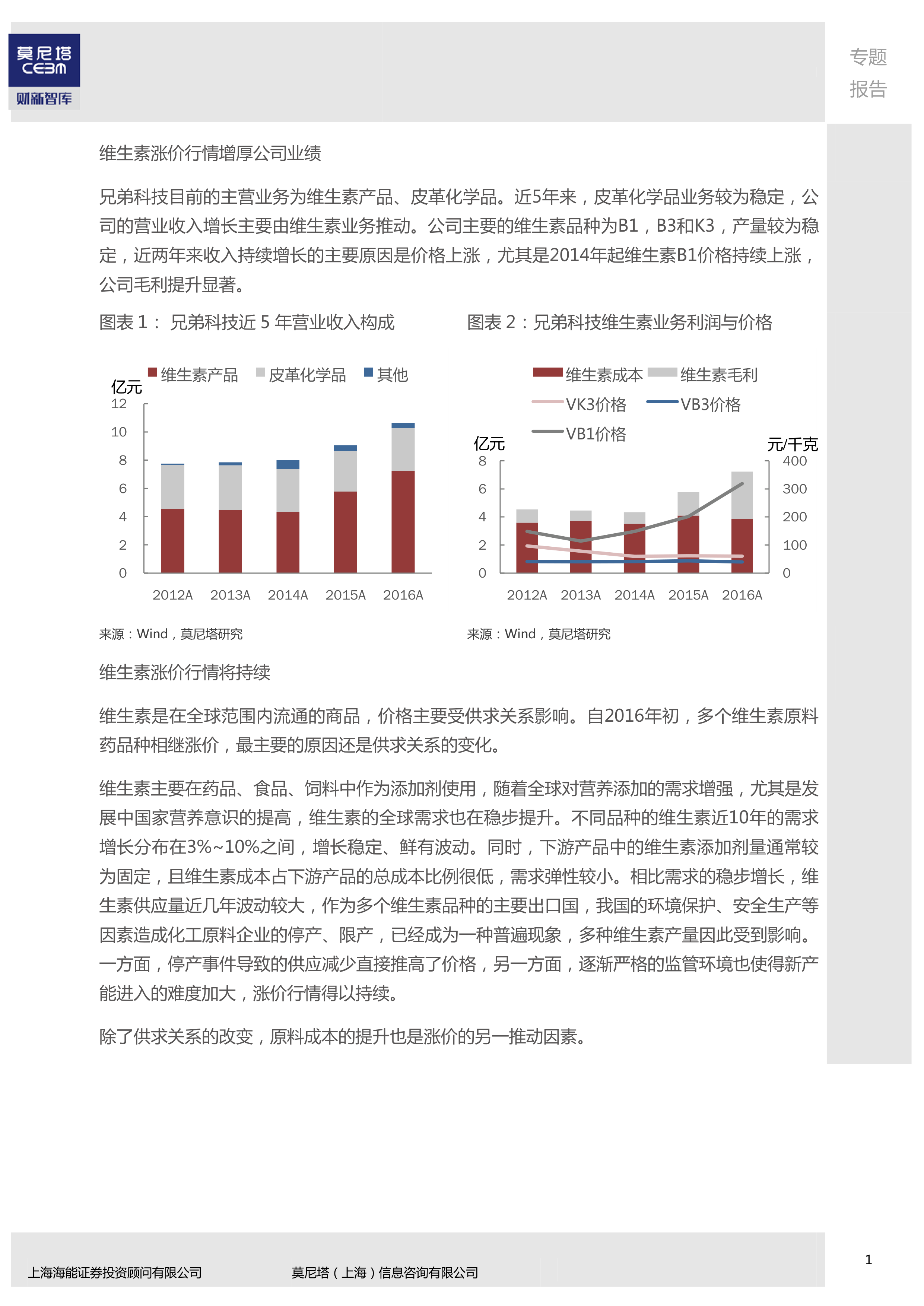 维生素价格上涨是兄弟科技公司业绩增长的主要驱动力。自2014年以来,维生素B1价格持续上涨,VB3和VK3也在2016年11月起迅速提价。报告预测,仅VB1、VB3、VK3三个品种在2017年就将为公司带来100%~150%的毛利润增长。这种涨价行情主要源于全球维生素需求的稳步增长和国内供给侧的波动,包括环保政策导致的限产和新产能进入的难度加大。