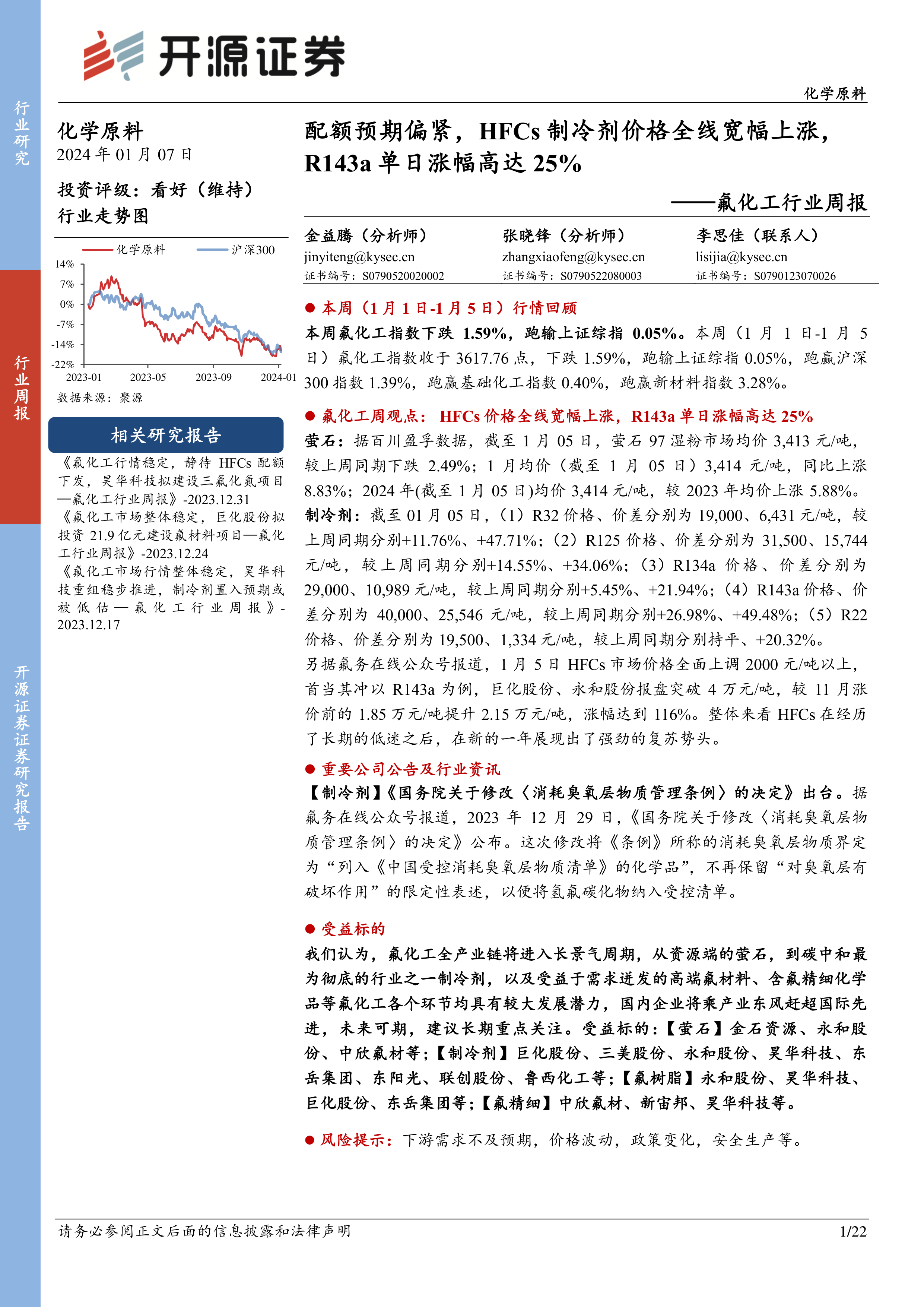 本报告对2024年1月第一周氟化工行业的行情进行了全面分析。HFCs制冷剂价格大幅上涨是本周市场最显著的特征,其背后是配额政策收紧带来的供给减少。萤石市场则表现相对疲软。 报告认为,氟化工全产业链将进入快速发展期,长期投资价值凸显,并建议长期关注相关受益标的。 然而,投资者也需关注下游需求、价格波动、政策变化以及安全生产等潜在风险。