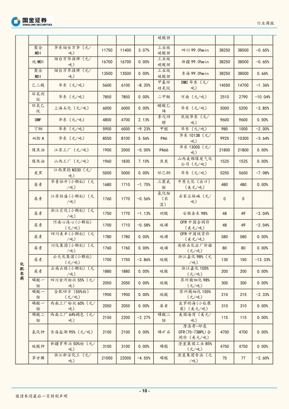 报告详细分析了化肥、煤化工、农药、维生素、氨基酸和聚氨酯等重点子行业的近期运行情况。