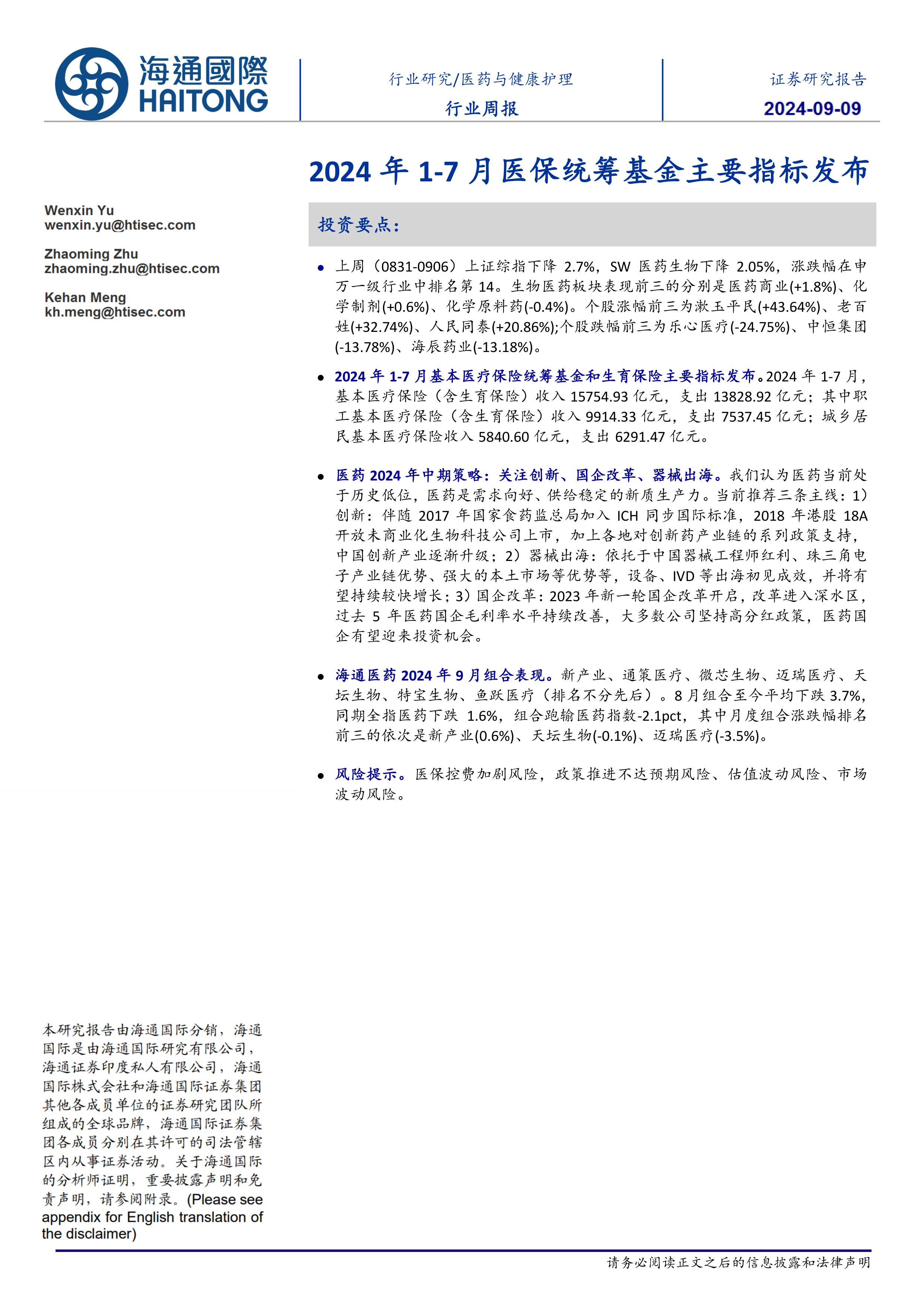 本报告的核心观点是:医药行业当前处于历史低位,但长期发展前景向好,具备投资价值。报告基于上周医药生物板块行情、2024年1-7月医保基金数据以及海通医药9月组合表现等数据,分析了医药行业现状及未来发展趋势,并推荐了关注创新、国企改革和器械出海三大主线。