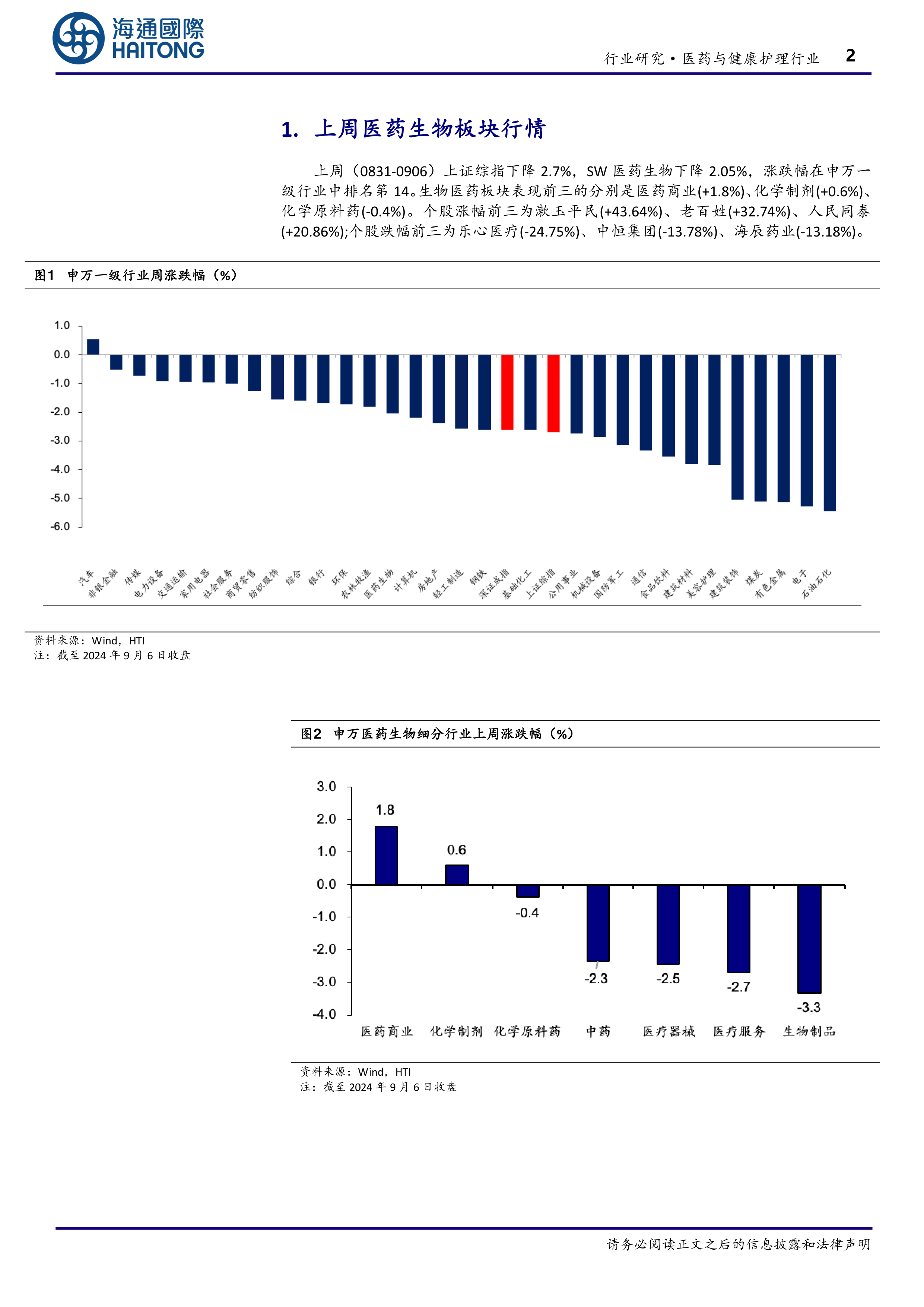 上周(0831-0906)上证综指下降2.7%,SW医药生物下降2.05%,涨跌幅在申万一级行业中排名第14。生物医药板块表现前三的分别是医药商业(+1.8%)、化学制剂(+0.6%)、化学原料药(-0.4%)。个股涨幅前三为漱玉平民(+43.64%)、老百姓(+32.74%)、人民同泰(+20.86%);个股跌幅前三为乐心医疗(-24.75%)、中恒集团(-13.78%)、海辰药业(-13.18%)。