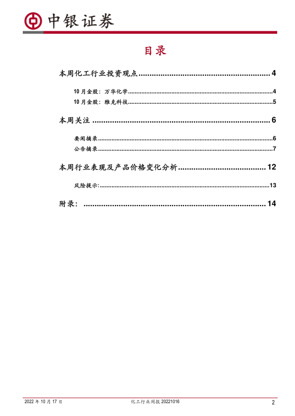 本报告涵盖了化工行业周报的多个方面,包括行业基础数据与变化、投资建议、个股分析、要闻摘录、公告摘录以及行业表现和产品价格变化分析。