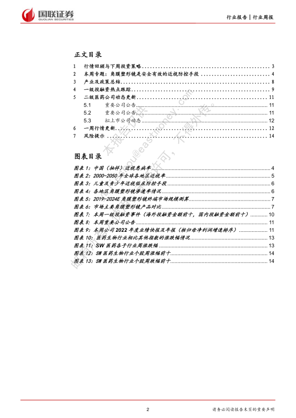 本周专题:角膜塑形镜是安全有效的近视防控手段: 详细分析了我国近视低龄化现状,阐述了角膜塑形镜的优势和市场前景,并对主要厂商进行了比较分析。 该部分包含多个图表,直观地展现了近视率数据、角膜塑形镜市场规模预测以及主要厂商的产品对比。