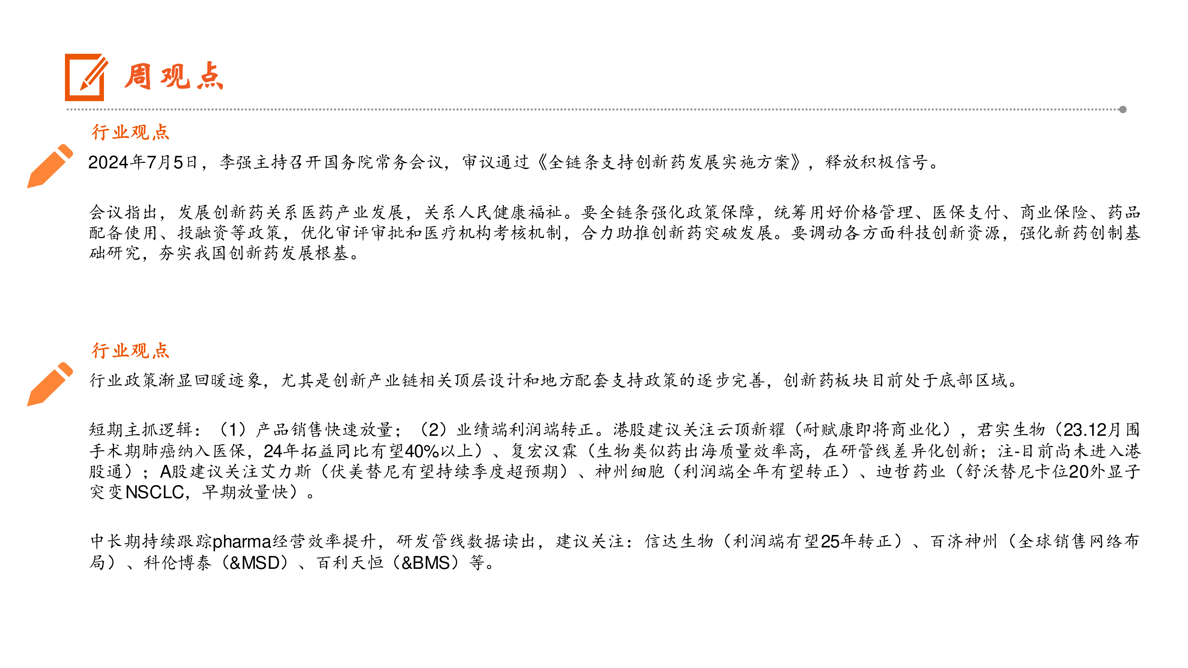 2024年7月5日,李强主持召开国务院常务会议,审议通过《全链条支持创新药发展实施方案》,释放积极信号。