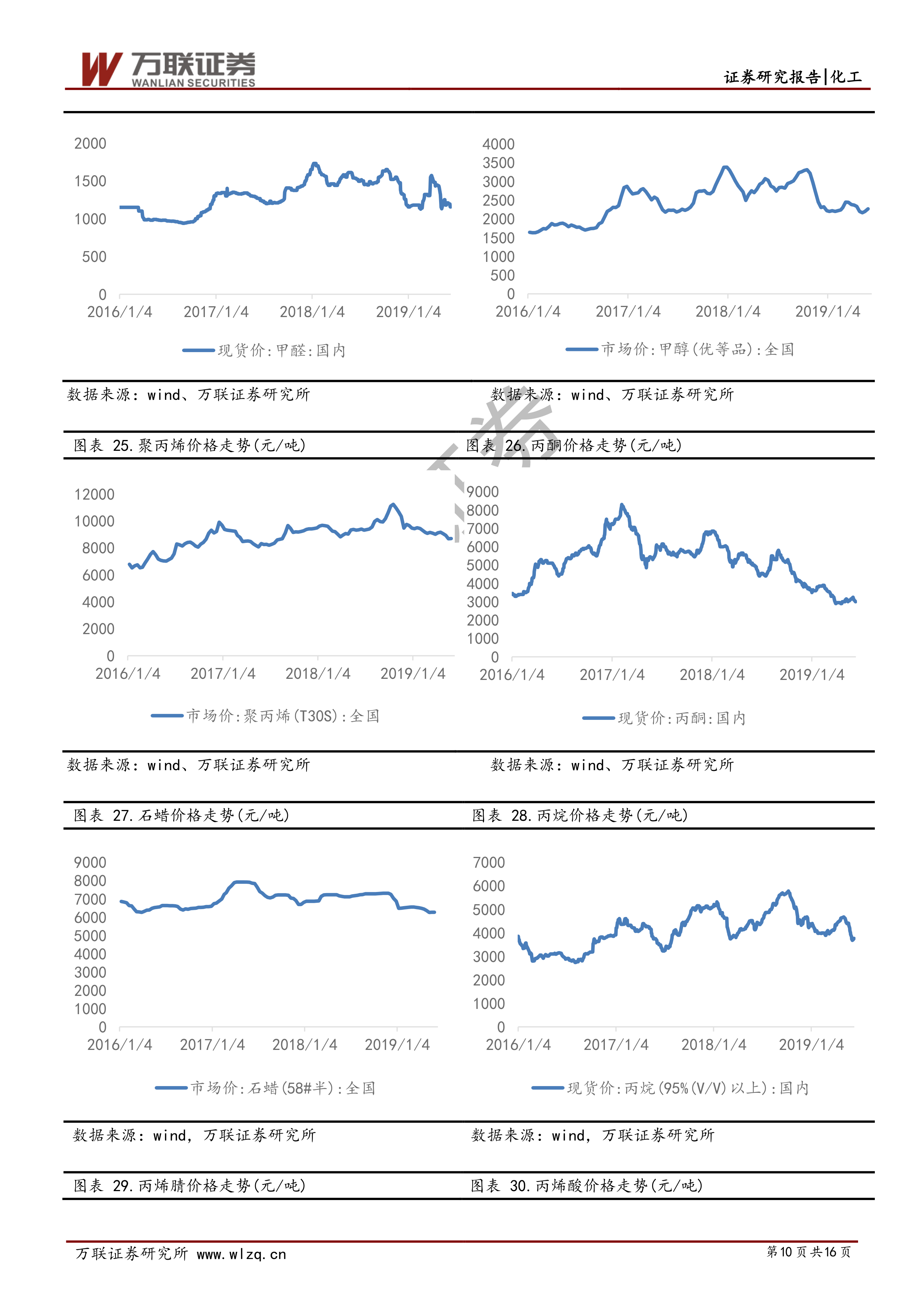 报告中提供了煤焦油、工业萘、煤沥青、苯乙烯、甲醛、甲醇、聚丙烯、丙酮、石蜡、丙烷、丙烯腈、丙烯酸、纯苯、醋酸、丁二烯、醋酸酐、己内酰胺、甘油、辛醇、无水乙醇、乙二醇、正丁醇、异丙醇、DMF、DOP、丙烯酸甲酯、甲基丙烯酸、正己烷、碳酸锂和DMC的价格走势图(图表19至图表48),但未提供具体的涨跌幅数据。