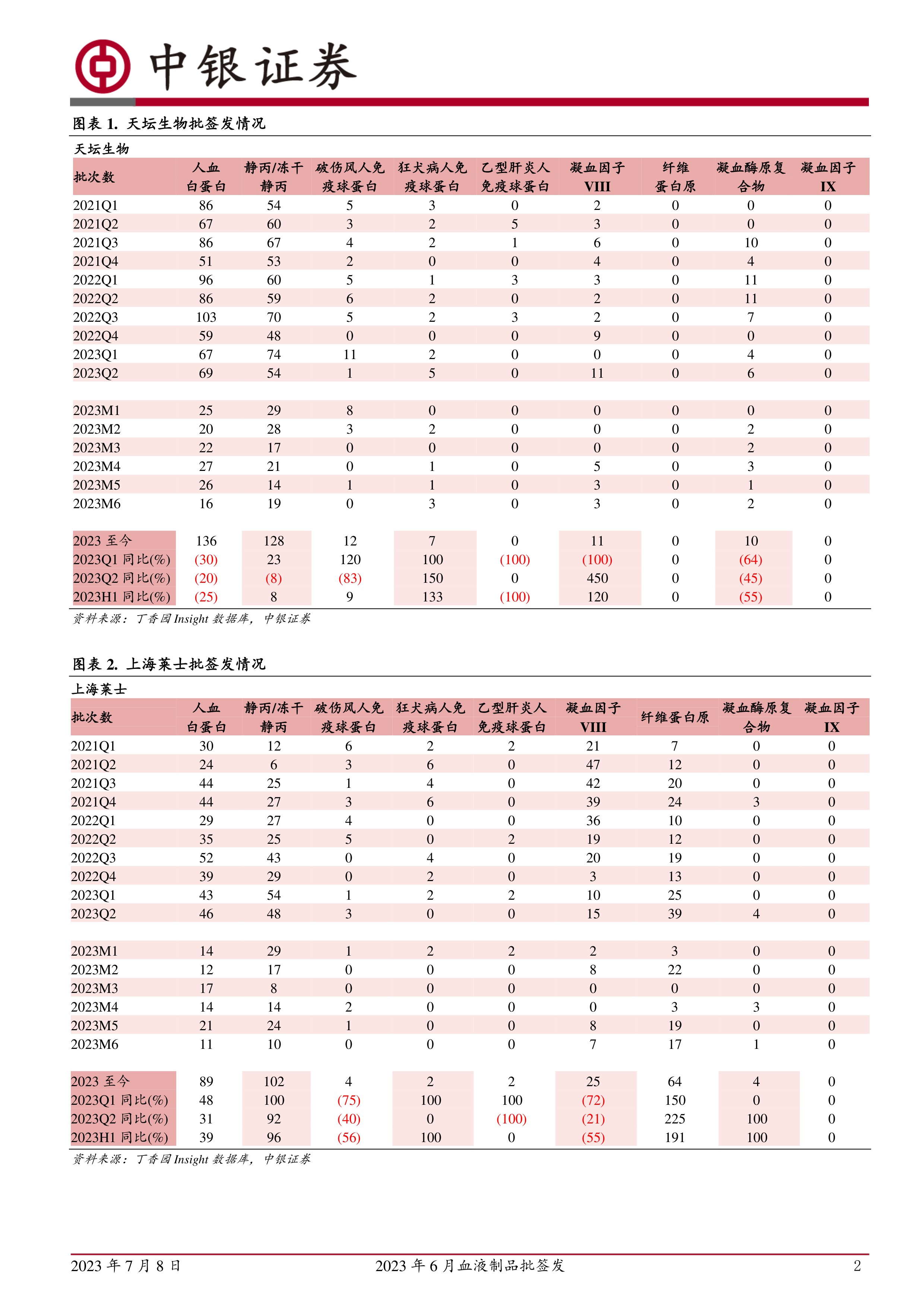 新冠疫情仍有部分影响。 2022 年末至 2023 年初,新冠疫情在国内大规模爆发,对于 2023 年一季度采浆产生了一定影响。根据血液制品行业传导周期, 2023Q1 采浆活动的受限将对 2023Q3 的产品产出带来压力。除此之外, 2023Q2 国内部分地区出现的新冠“二阳”疫情,也可能对采浆量产生了一定影响。因此, 2023 年下半年血液制品行业整体供给可能趋紧,可能会出现提前备货的情况。