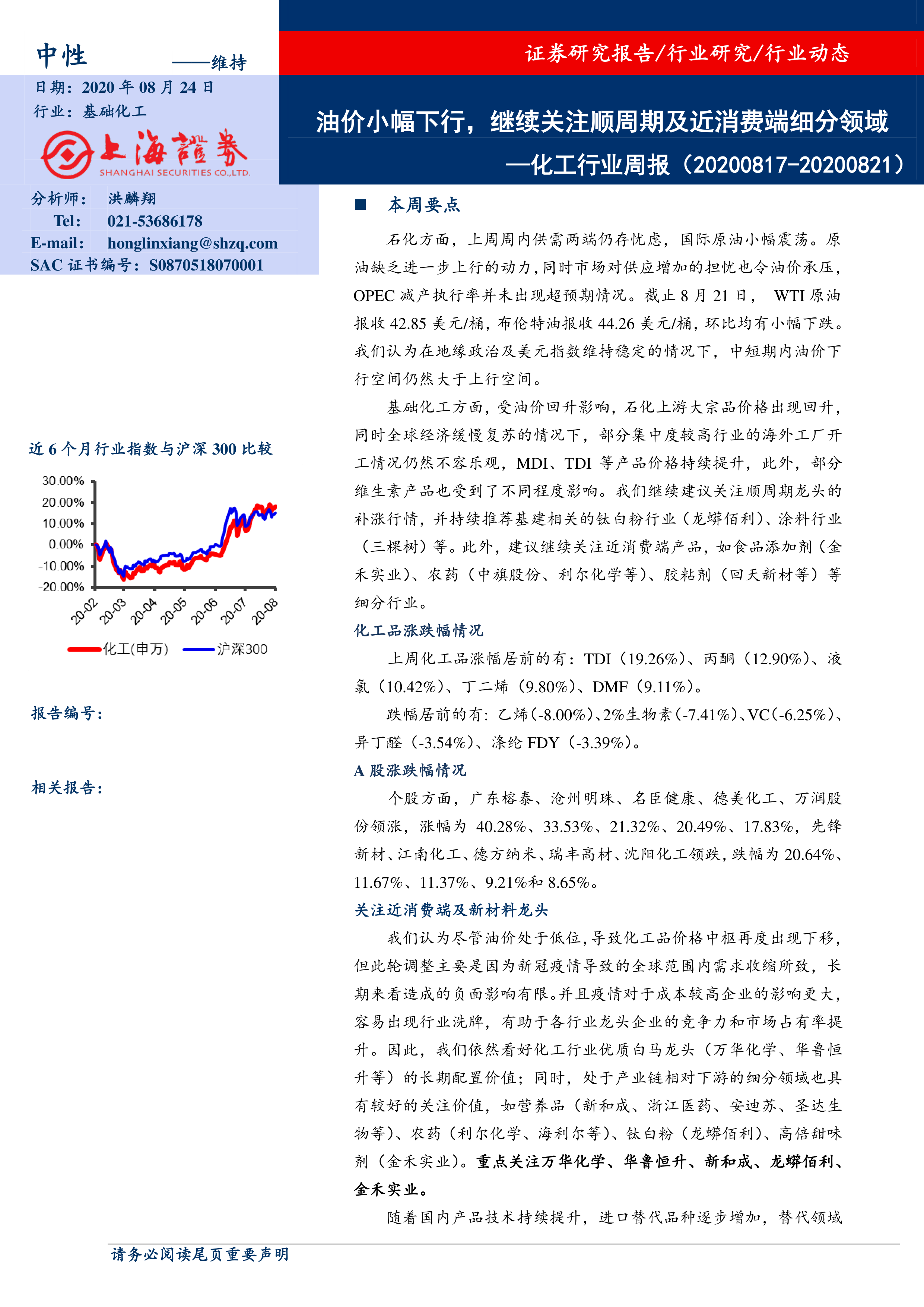 本报告对2020年8月17日至2020年8月21日期间的化工行业进行了周报总结。报告指出,尽管国际油价小幅下行,但化工行业整体维持“中性”评级。短期油价波动受多种因素影响,但长期来看,疫情导致的需求收缩是此轮化工品价格调整的主要原因。投资策略应关注传统化工领域的低估值龙头企业和近消费端细分行业,以及新材料领域国产替代潜力巨大的细分行业。报告还对部分重点关注股票进行了简要分析,并提供了相关化工产品价格走势图表。 投资者应结合自身情况,谨慎决策。