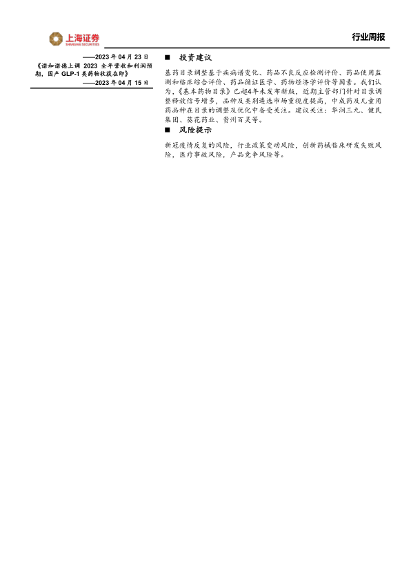 基药目录调整基于疾病谱变化、药品不良反应检测评价、药品使用监测和临床综合评价、药品循证医学、药物经济学评价等因素。我们认为,《基本药物目录》已超4年未发布新版,近期主管部门针对目录调整释放信号增多,品种及类别遴选市场重视度提高,中成药及儿童用药品种在目录的调整及优化中备受关注。建议关注:华润三九、健民集团、葵花药业、贵州百灵等。