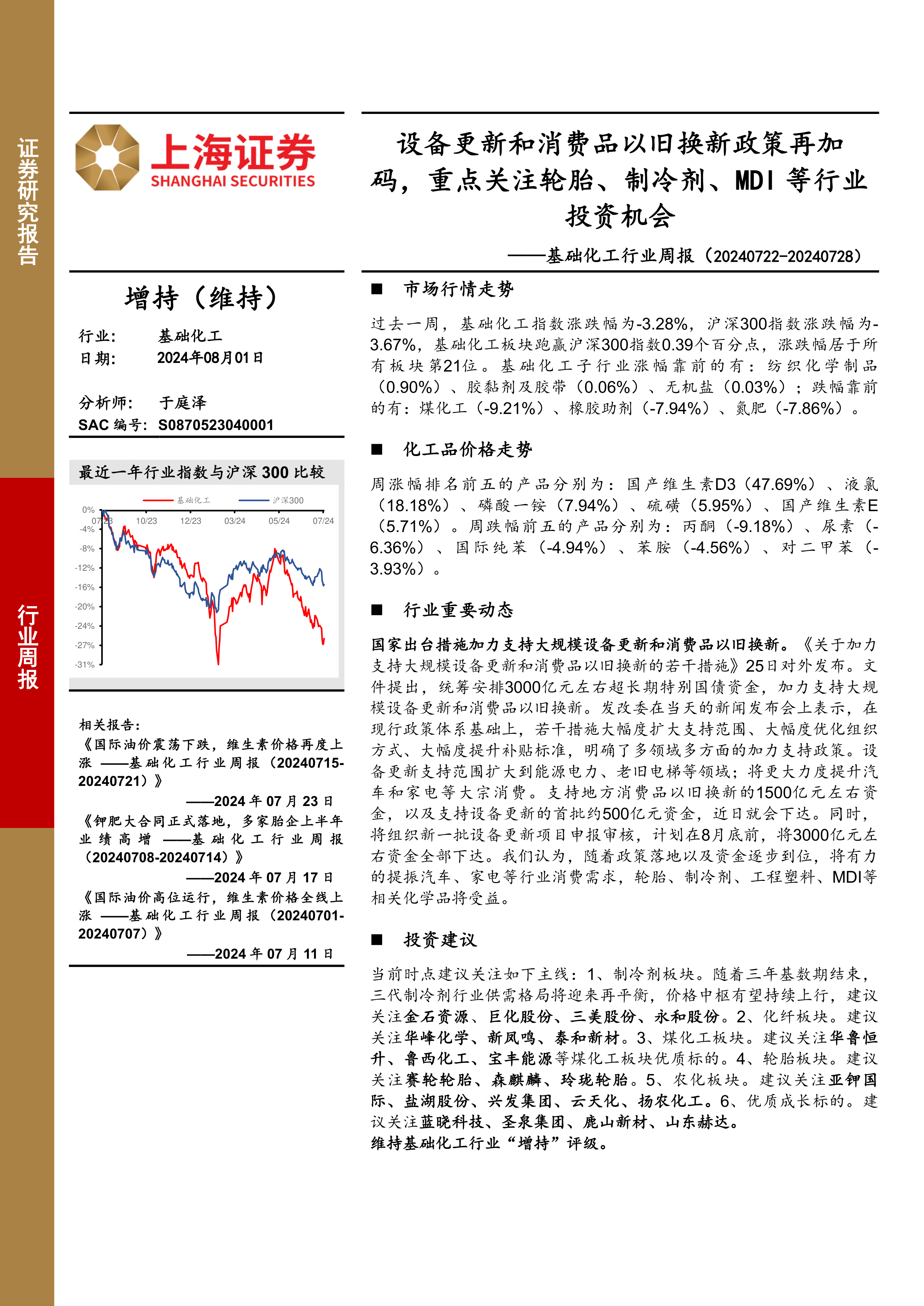 本报告的核心观点是:国家出台的3000亿元设备更新和消费品以旧换新政策将有力提振相关行业消费需求,其中轮胎、制冷剂、MDI等基础化工相关行业将显著受益。报告同时分析了基础化工行业近期市场行情、化工品价格走势以及重点个股动态,并据此给出投资建议,维持基础化工行业“增持”评级。