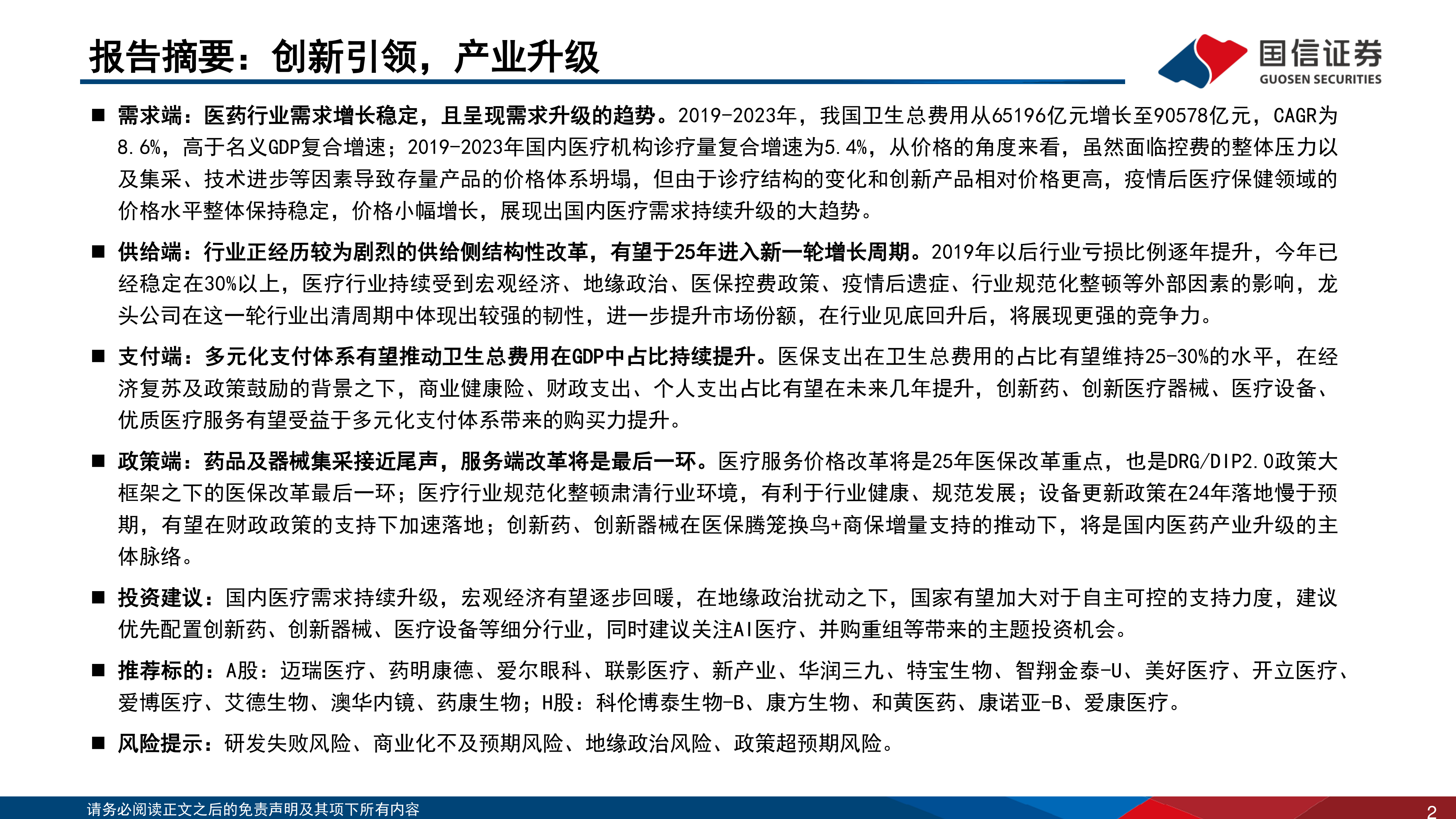 投资建议:国内医疗需求持续升级,宏观经济有望逐步回暖,在地缘政治扰动之下,国家有望加大对于自主可控的支持力度,建议优先配置创新药、创新器械、医疗设备等细分行业,同时建议关注AI医疗、并购重组等带来的主题投资机会。