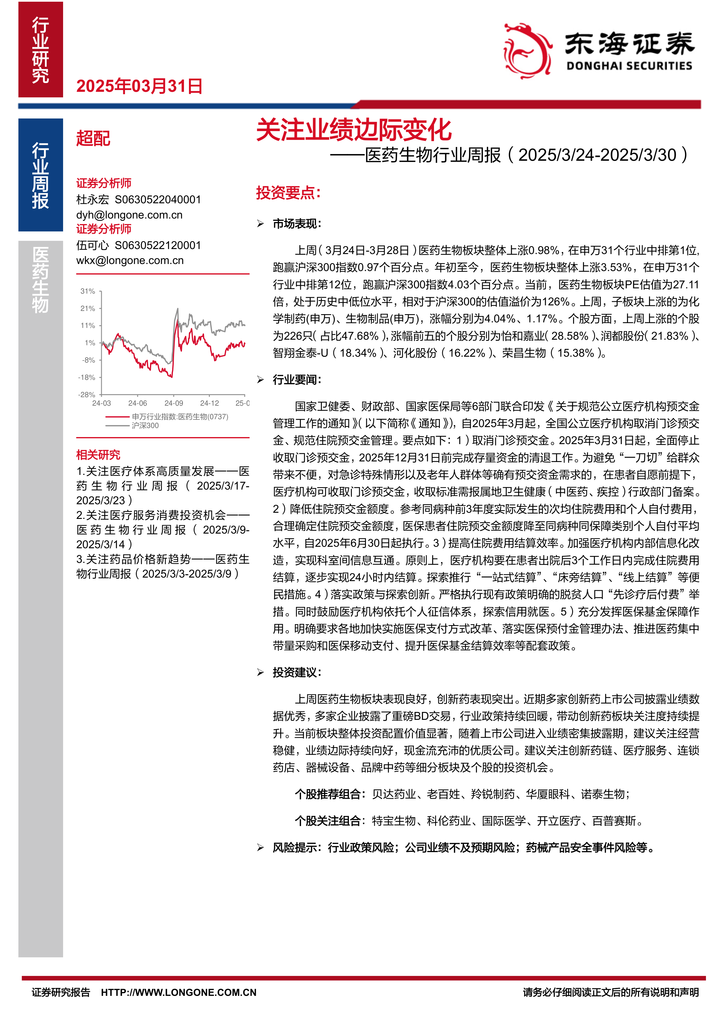 本报告的核心观点是:2025年3月24日至3月30日,医药生物板块整体表现强劲,跑赢大盘,估值处于历史中低位,具有显著的投资价值。 取消门诊预交金和规范住院预交金管理等政策的出台,进一步利好行业发展。 建议关注创新药链、医疗服务、连锁药店、器械设备、品牌中药等细分板块及个股的投资机会。