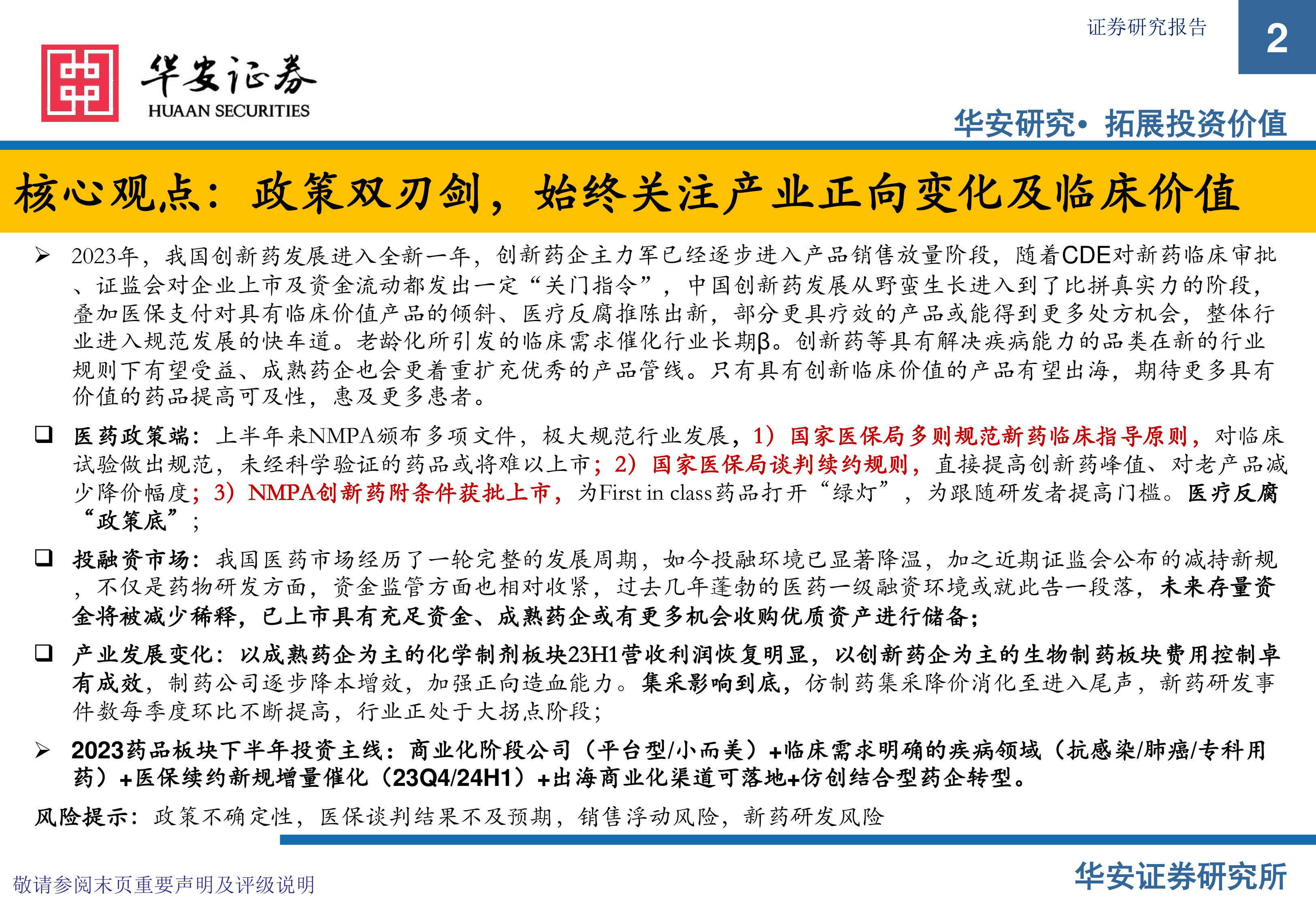 2023年,我国创新药发展进入全新一年,创新药企主力军已经逐步进入产品销售放量阶段,随着CDE对新药临床审批、证监会对企业上市及资金流动都发出一定“关门指令”,中国创新药发展从野蛮生长进入到了比拼真实力的阶段,叠加医保支付对具有临床价值产品的倾斜、医疗反腐推陈出新,部分更具疗效的产品或能得到更多处方机会,整体行业进入规范发展的快车道。老龄化所引发的临床需求催化行业长期β。创新药等具有解决疾病能力的品类在新的行业规则下有望受益、成熟药企也会更着重扩充优秀的产品管线。只有具有创新临床价值的产品有望出海,期待更多具有价值的药品提高可及性,惠及更多患者。