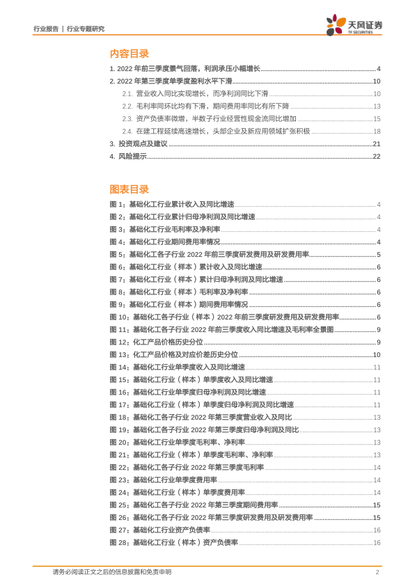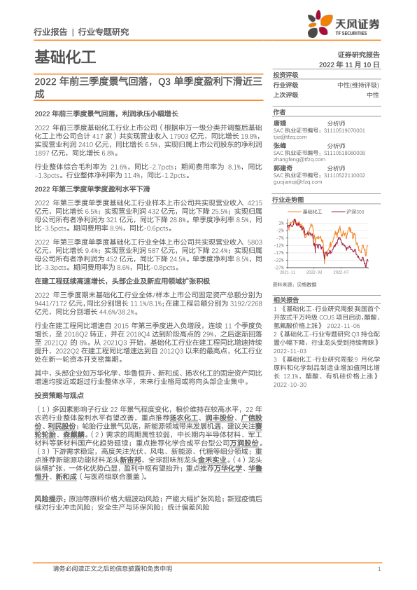 本报告对2022年前三季度基础化工行业进行了全面分析,数据显示行业整体景气度回落,利润承压,但仍保持小幅增长。第三季度单季度盈利出现显著下滑,毛利率下降,净利润同比大幅减少。然而,在建工程投资持续高速增长,头部企业积极扩张,行业格局或将向头部企业集中。 投资者需密切关注原油价格波动、产能扩张、疫情冲击、安全生产及环保等风险,并对不同子行业进行差异化分析,才能做出更准确的投资决策。 报告中推荐的重点公司涵盖农药、轮胎、新材料、新能源功能材料和龙头化工企业,体现了对行业未来发展方向的判断。