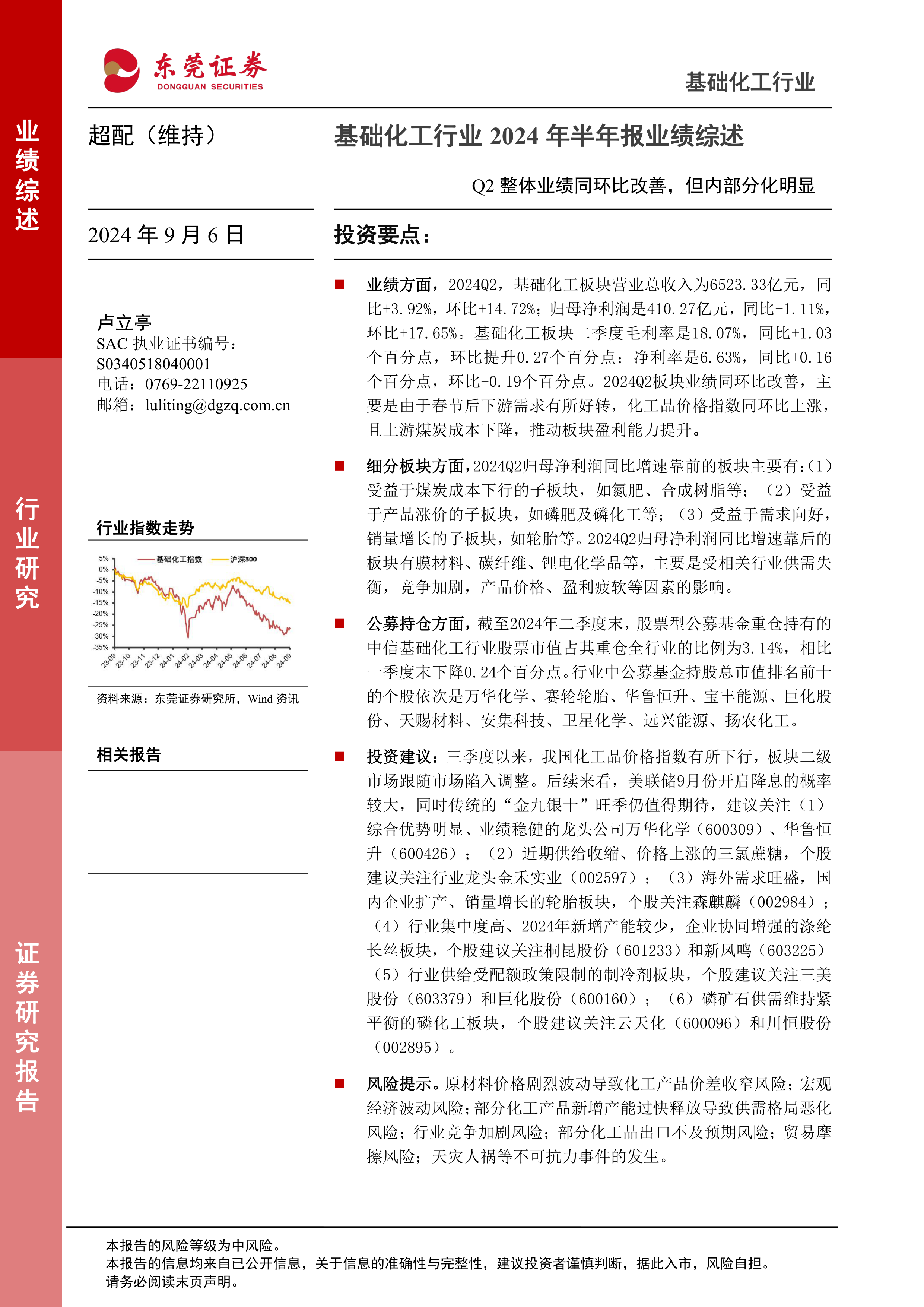 本报告基于东莞证券研究所发布的《基础化工行业2024年半年报业绩综述》报告,运用数据和统计分析方法,对2024年上半年及第二季度基础化工行业市场表现进行专业分析。核心观点如下: