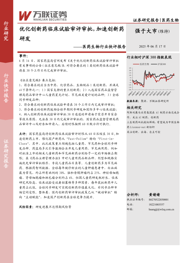 本报告为医药生物行业快评报告,发布日期为2025年6月17日,评级为“强于大市”。报告主要分析了国家药监局发布的《关于优化创新药临床试验审评审批有关事项的公告(征求意见稿)》对医药生物行业的影响。