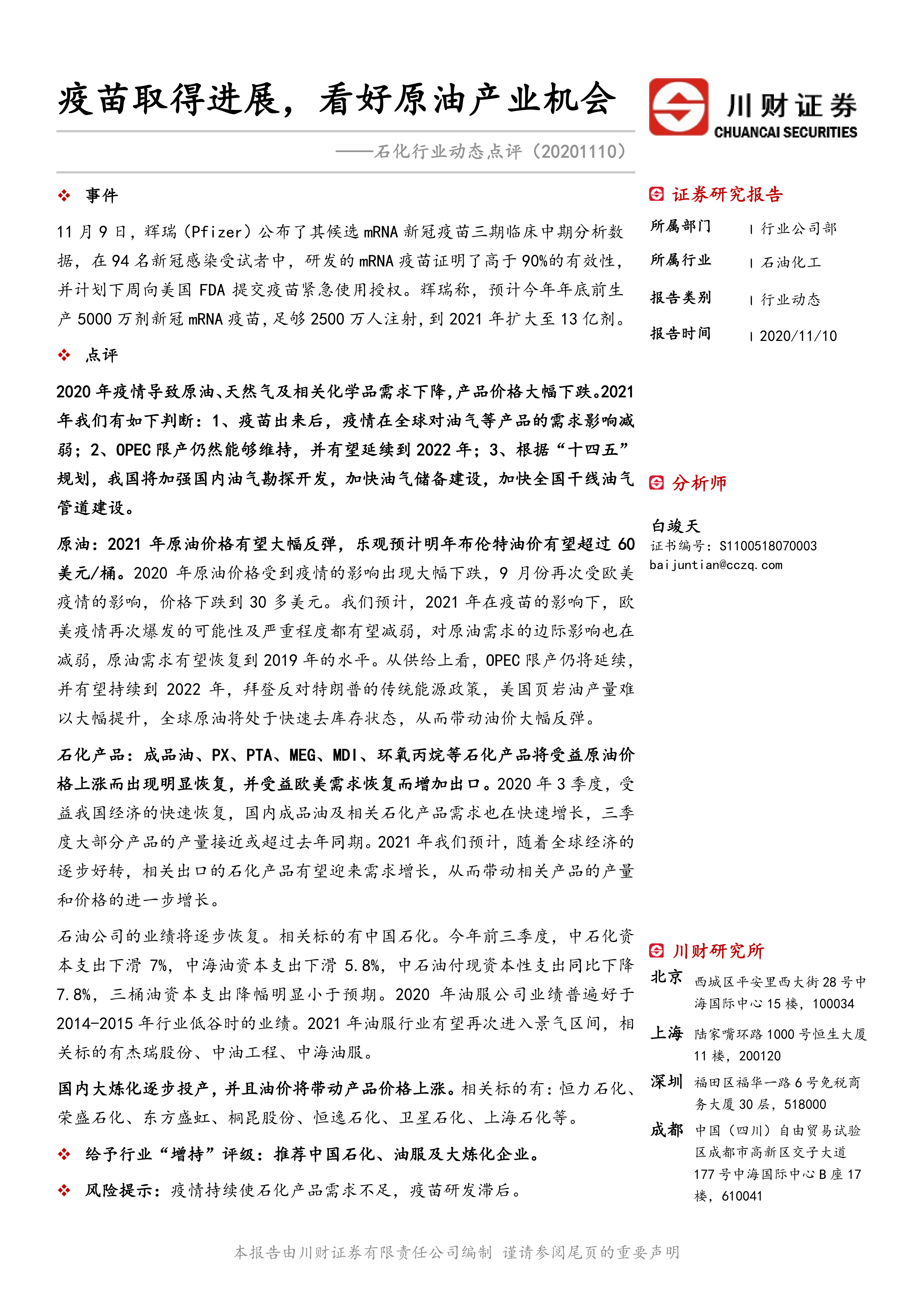 本报告基于辉瑞公司新冠疫苗研发取得的重大进展,对石化行业未来发展趋势进行了分析和预测。报告认为,疫苗的成功研发和应用将减弱疫情对全球原油需求的负面影响,叠加OPEC限产政策的持续以及中国“十四五”规划对国内油气产业的支持,预计2021年原油价格将大幅反弹,带动石化产品价格上涨,进而利好相关上市公司业绩。报告给予石化行业“增持”评级,并推荐中国石化、油服及大炼化企业。 然而,报告也提示了疫情持续以及疫苗研发滞后的风险。投资者需谨慎评估风险,做出理性投资决策。