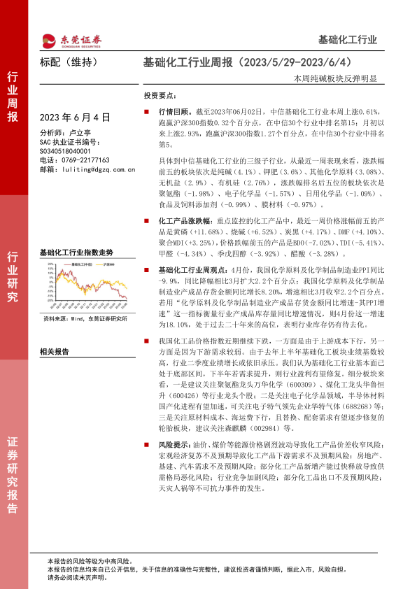 风险提示:油价、煤价等能源价格剧烈波动导致化工产品价差收窄风险;宏观经济复苏不及预期导致化工产品下游需求不及预期风险;房地产、基建、汽车需求不及预期风险;部分化工产品新增产能过快释放导致供需格局恶化风险;行业竞争加剧风险;部分化工品出口不及预期风险;天灾人祸等不可抗力事件的发生。