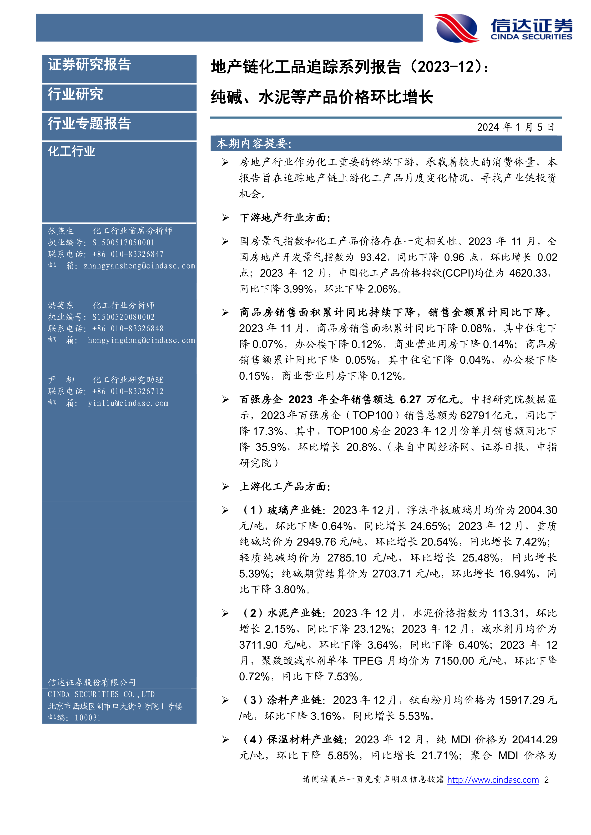 本报告的核心观点是:房地产市场景气度与上游化工产品价格存在一定相关性。2023年12月,尽管全国房地产开发景气指数环比微增,但商品房销售面积和销售额仍持续下降,百强房企全年销售额同比下降17.3%。在此背景下,部分与房地产密切相关的化工产品价格出现分化:纯碱、浮法平板玻璃等产品价格同比增长,而水泥、减水剂、DMC等产品价格同比下降。报告分析了房地产市场现状及主要化工产品价格的月度变化,并指出了潜在的风险因素。