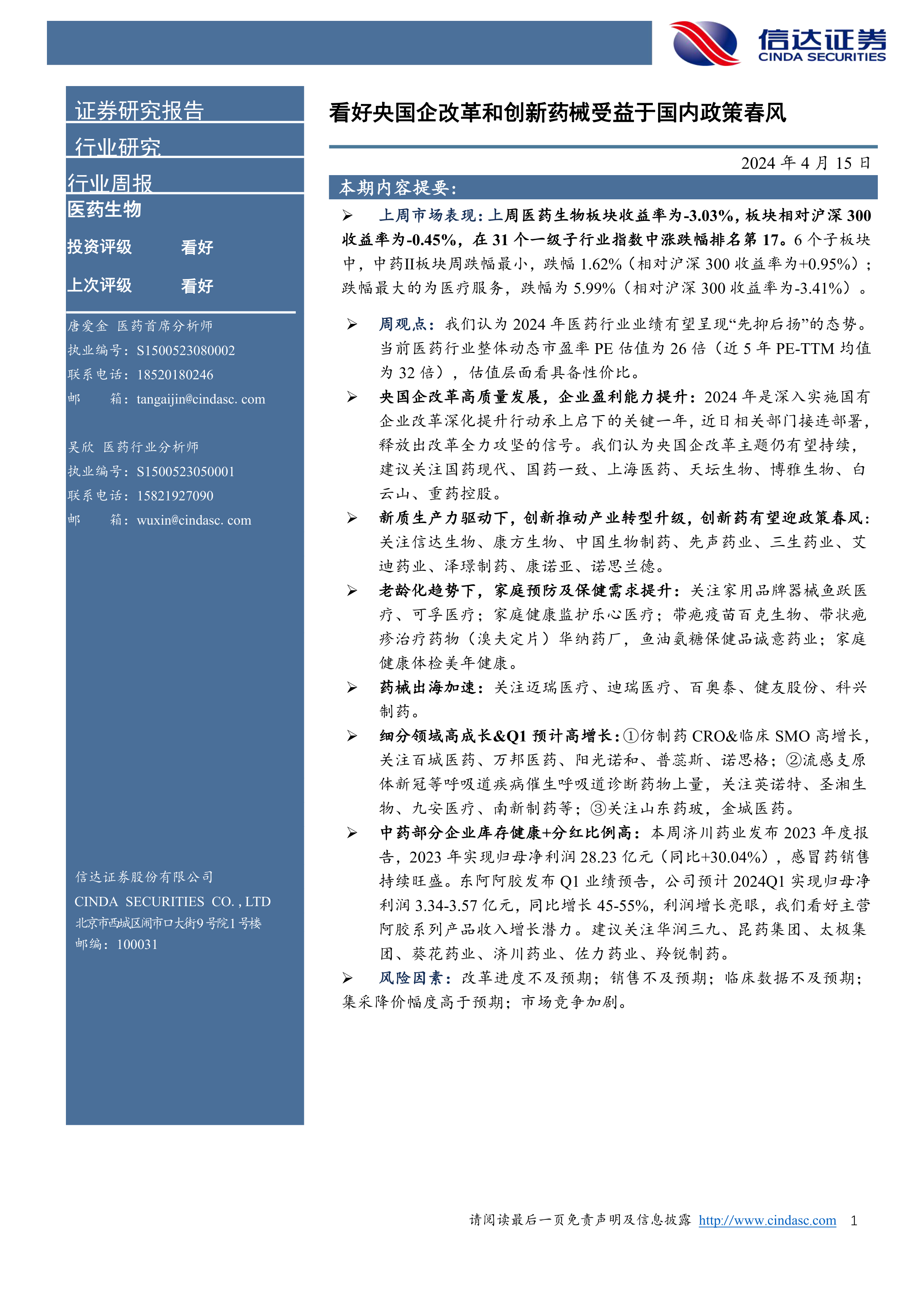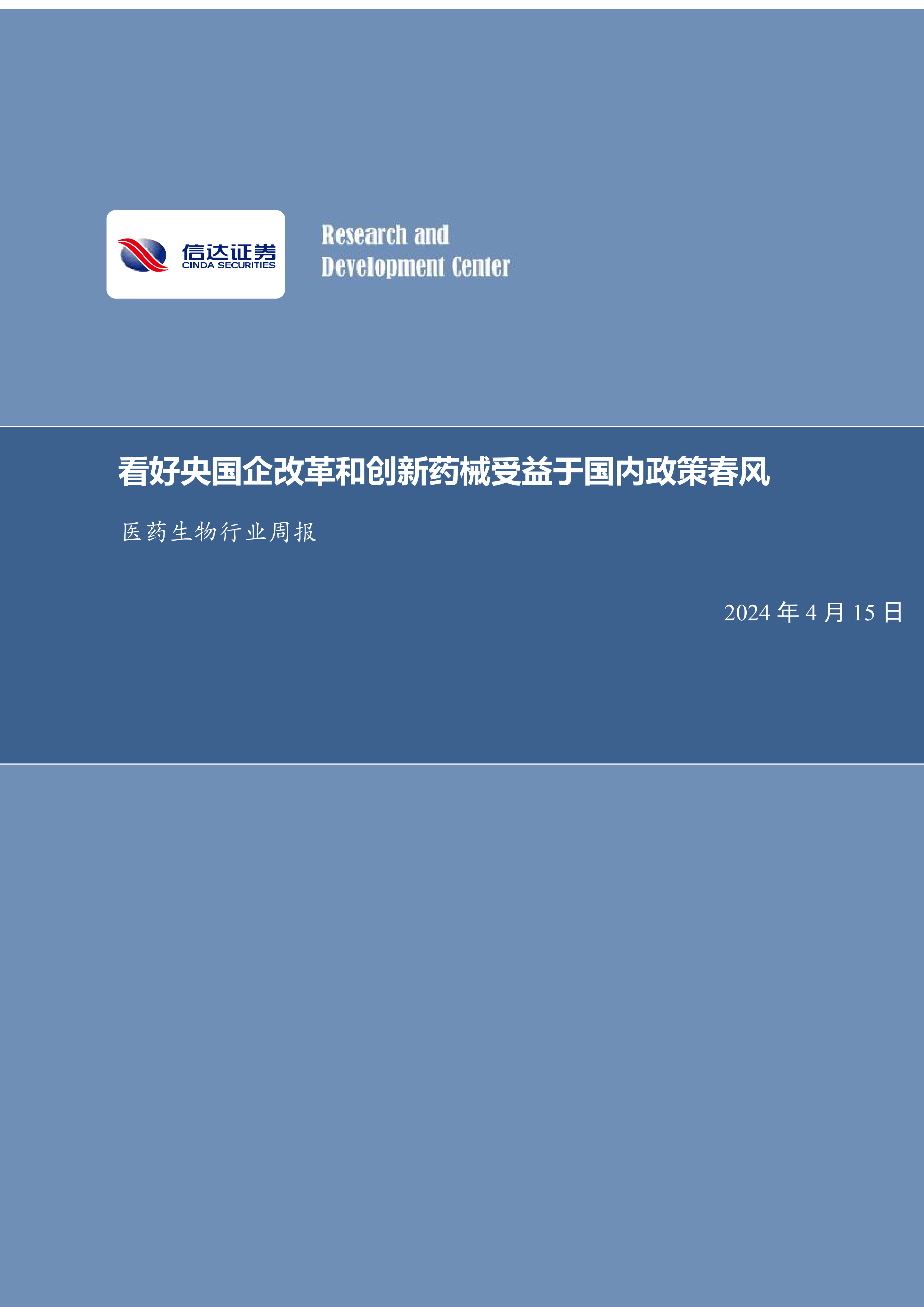 医药生物行业周报:看好央国企改革和创新药械受益于国内政策春风