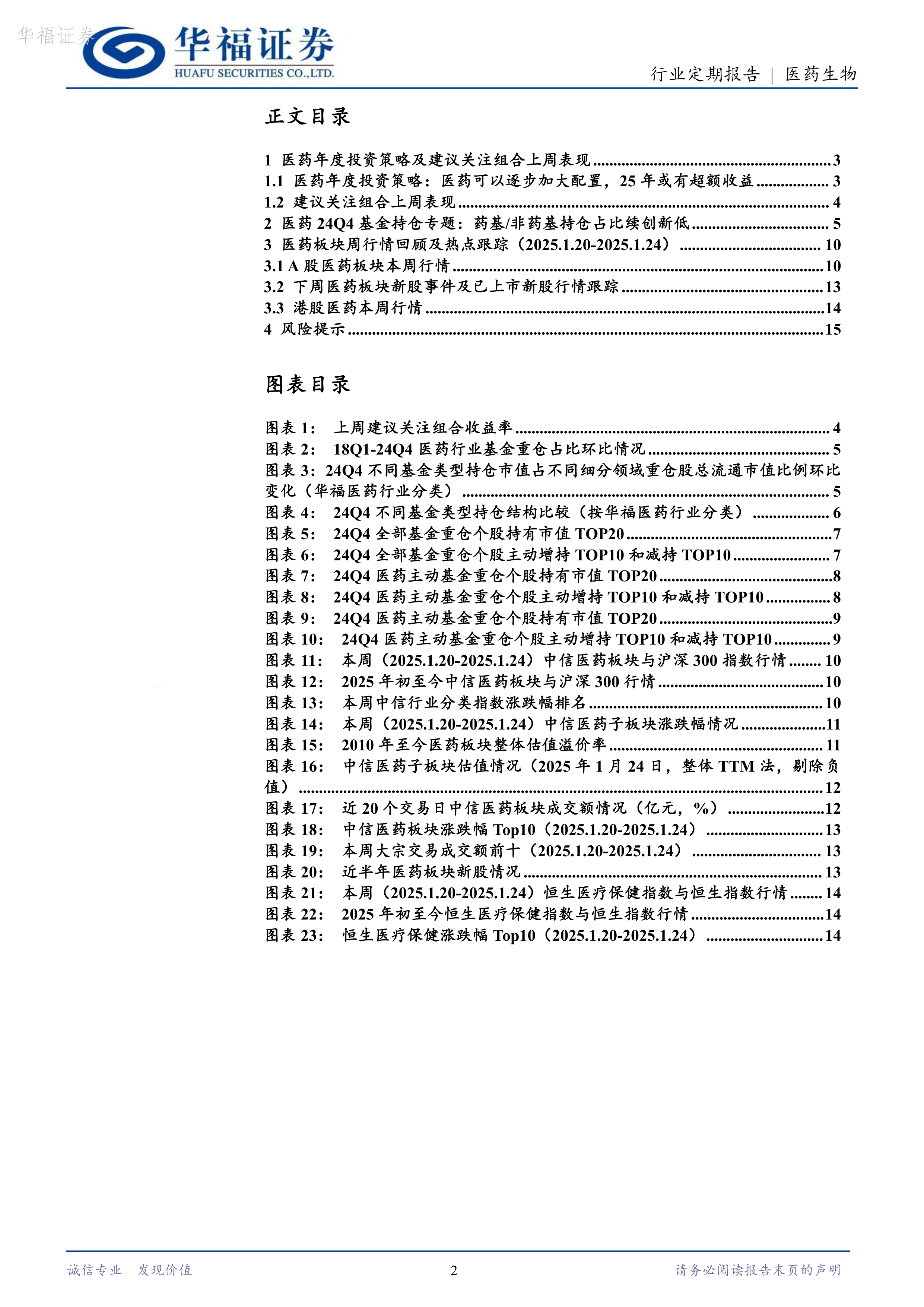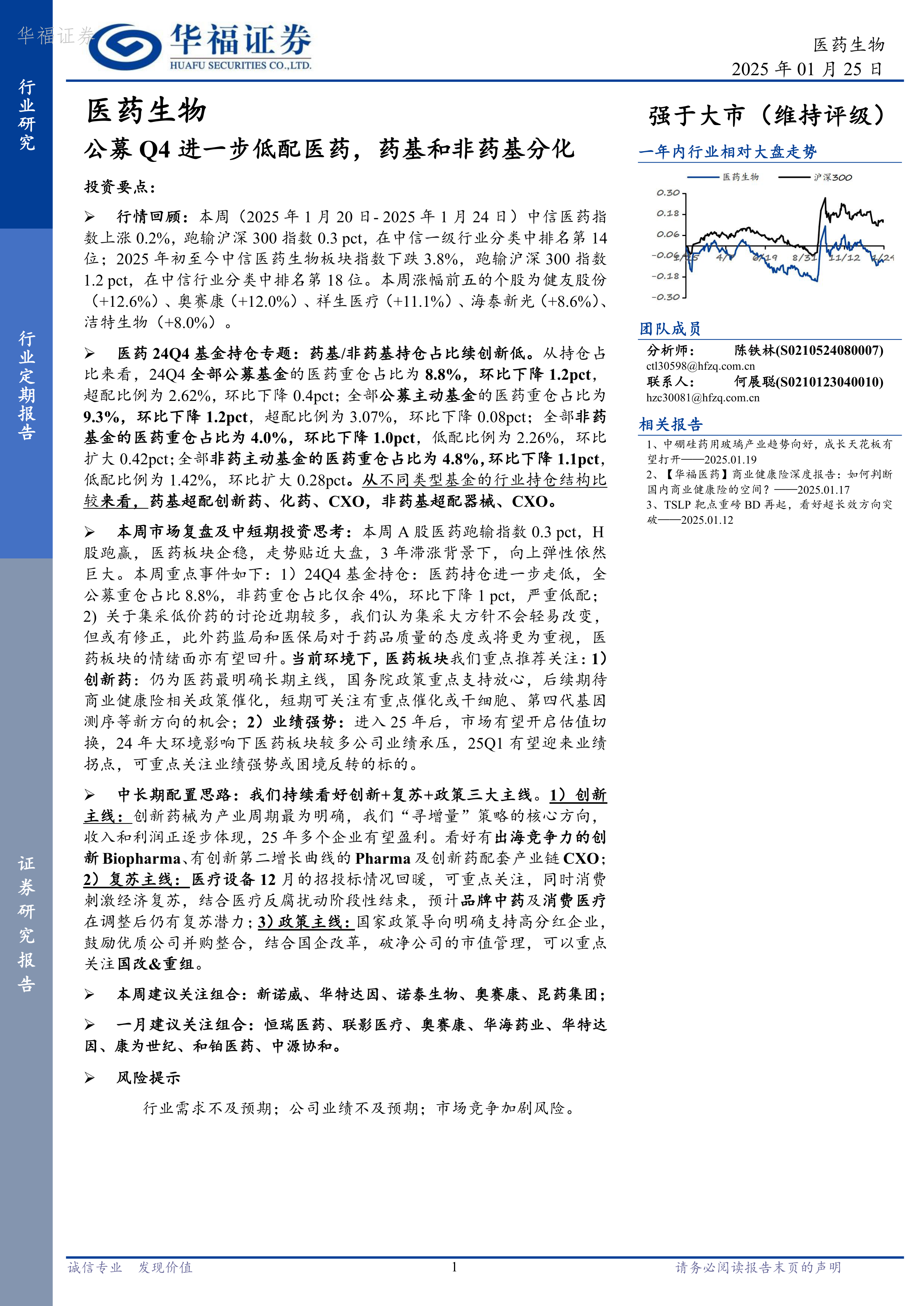 本报告基于华福证券对医药生物行业的分析,利用统计数据对2025年1月医药行业市场表现进行了深入分析。报告指出,尽管短期内公募基金持续低配,A股医药板块表现弱于大盘,但长期来看,创新药、医疗设备复苏和政策支持三大主线仍是医药行业值得关注的投资方向。 报告详细分析了基金持仓变化、行业周行情以及潜在风险,为投资者提供了参考信息。 然而,投资者仍需谨慎决策,并自行承担投资风险。