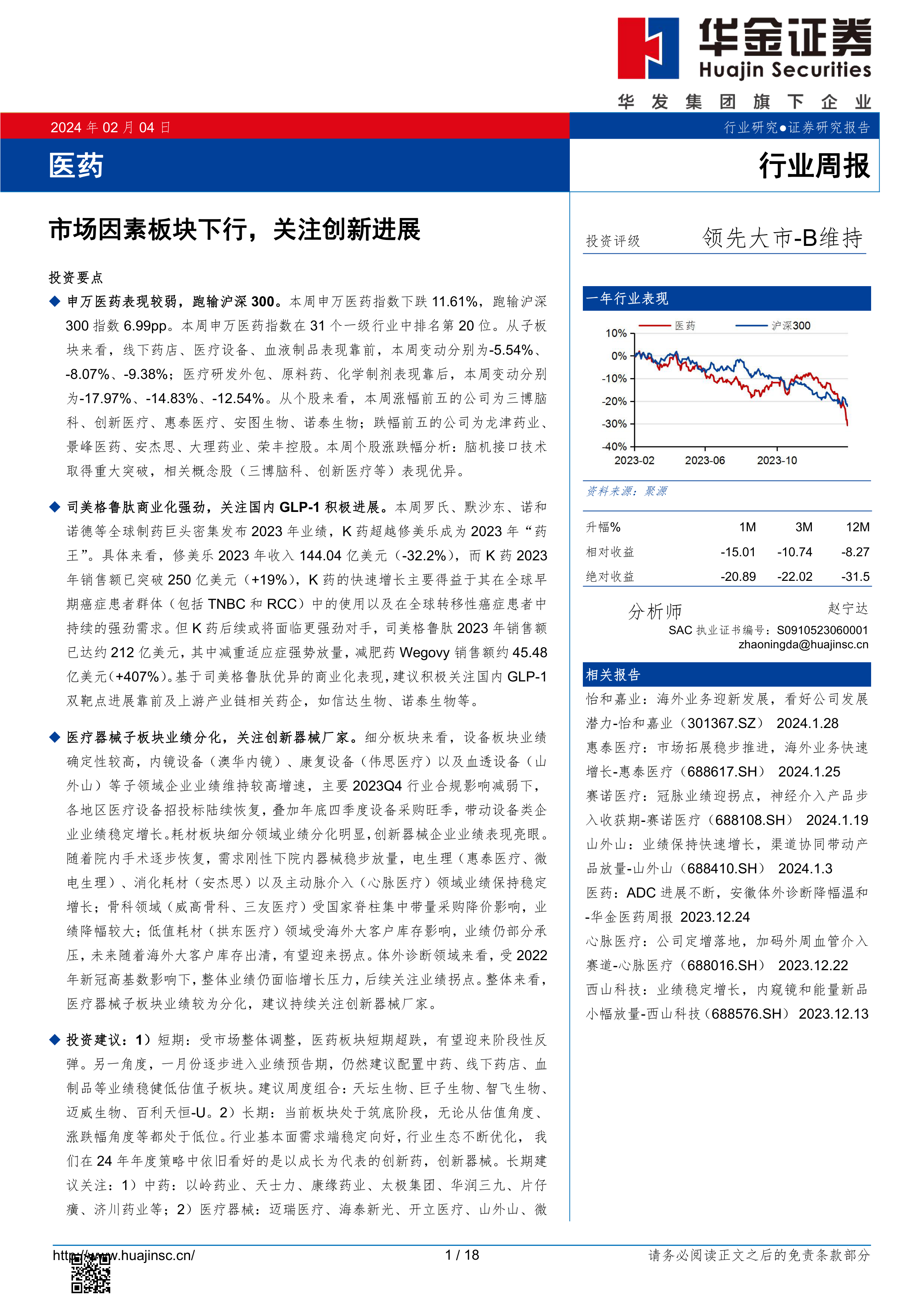 本报告对2024年2月第一周医药行业市场行情进行了全面分析,数据显示申万医药指数表现疲软,但部分细分板块和个股表现亮眼。短期市场波动较大,但长期来看,医药行业基本面稳健,创新驱动发展趋势不变,具备长期投资价值。 报告建议投资者关注业绩稳健、估值较低的子板块,并长期关注创新药和创新医疗器械领域的投资机会,同时需注意相关风险。