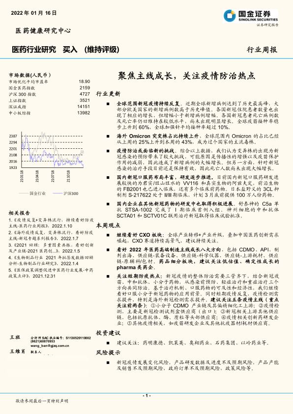 报告对医药行业进行了更新,并提出了相应的投资建议。报告建议继续看好CXO板块以及医药高端制造等领域,并重点关注与疫情防治相关的产业链,包括小分子CDMO产业链、疫情检测、新冠相关上游供应链、疫情相关创新药研发企业以及其他抗疫器材/耗材供应商等。报告还列出了具体的投资建议,包括建议关注的企业名单。
