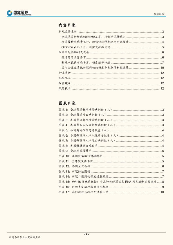本报告基于公开数据和市场分析,对全球新冠疫情形势、国内新冠药物研发进展以及医药行业投资机会进行了深入分析。报告指出,虽然Omicron变异株的出现对疫情防控带来新的挑战,但现有治疗手段仍然有效,国内新冠药物研发进展迅速,为疫情防控提供了新的选择。投资方面,建议关注CXO板块、医药高端制造以及疫情防治相关产业链,同时需关注相关风险。 报告数据翔实,分析透彻,为投资者提供了有价值的参考信息。 需要注意的是,报告中的信息和观点仅供参考,不构成投资建议。投资者应根据自身情况进行独立判断和决策。
