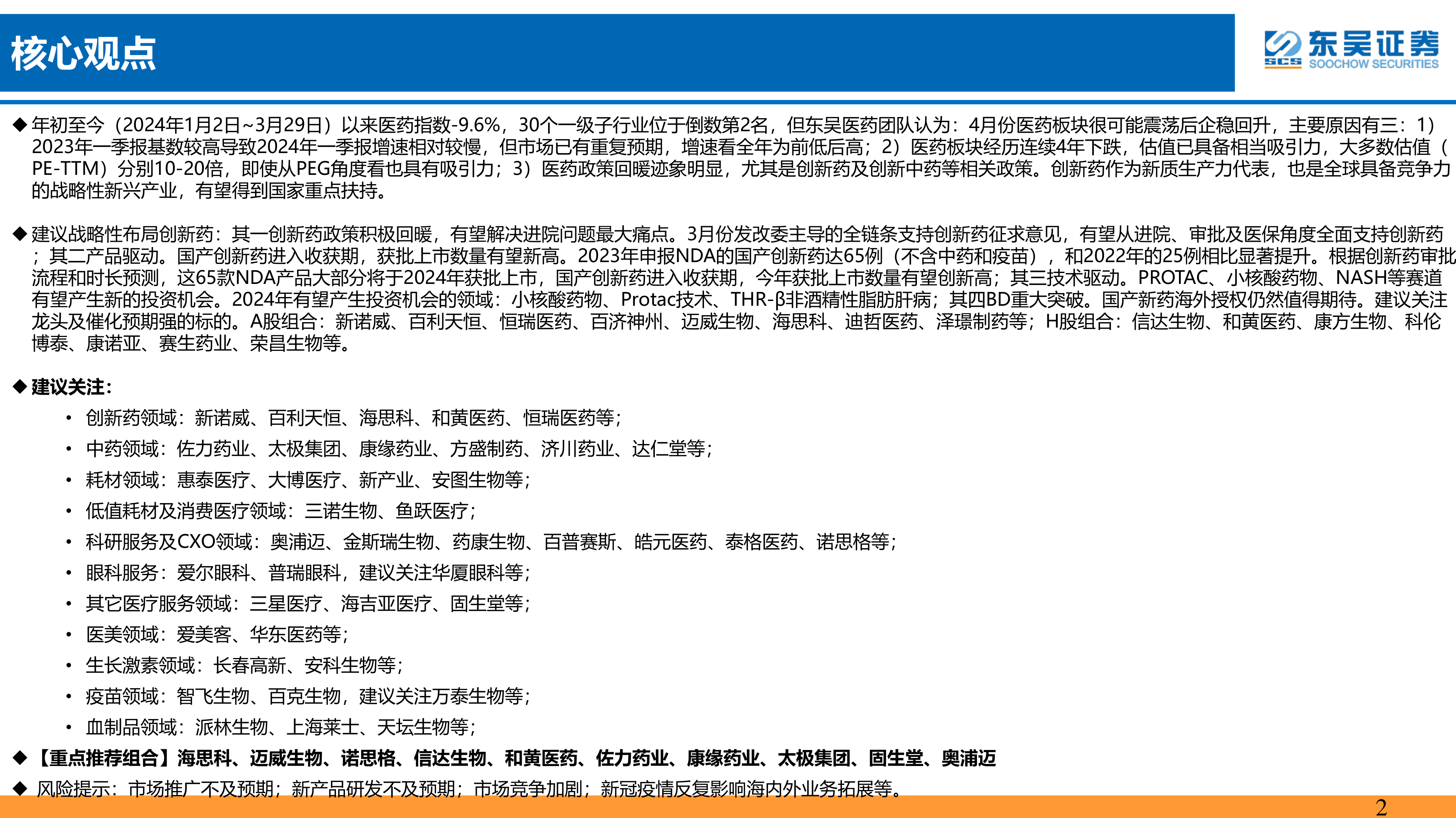 建议战略性布局创新药:其一创新药政策积极回暖,有望解决进院问题最大痛点。3月份发改委主导的全链条支持创新药征求意见,有望从进院、审批及医保角度全面支持创新药;其二产品驱动。国产创新药进入收获期,获批上市数量有望新高。2023年申报NDA的国产创新药达65例(不含中药和疫苗),和2022年的25例相比显著提升。根据创新药审批流程和时长预测,这65款NDA产品大部分将于2024年获批上市,国产创新药进入收获期,今年获批上市数量有望创新高;其三技术驱动。PROTAC、小核酸药物、NASH等赛道有望产生新的投资机会。2024年有望产生投资机会的领域:小核酸药物、Protac技术、THR-β非酒精性脂肪肝病;其四BD重大突破。国产新药海外授权仍然值得期待。建议关注龙头及催化预期强的标的。A股组合:新诺威、百利天恒、恒瑞医药、百济神州、迈威生物、海思科、迪哲医药、泽璟制药等;H股组合:信达生物、和黄医药、康方生物、科伦博泰、康诺亚、赛生药业、荣昌生物等。