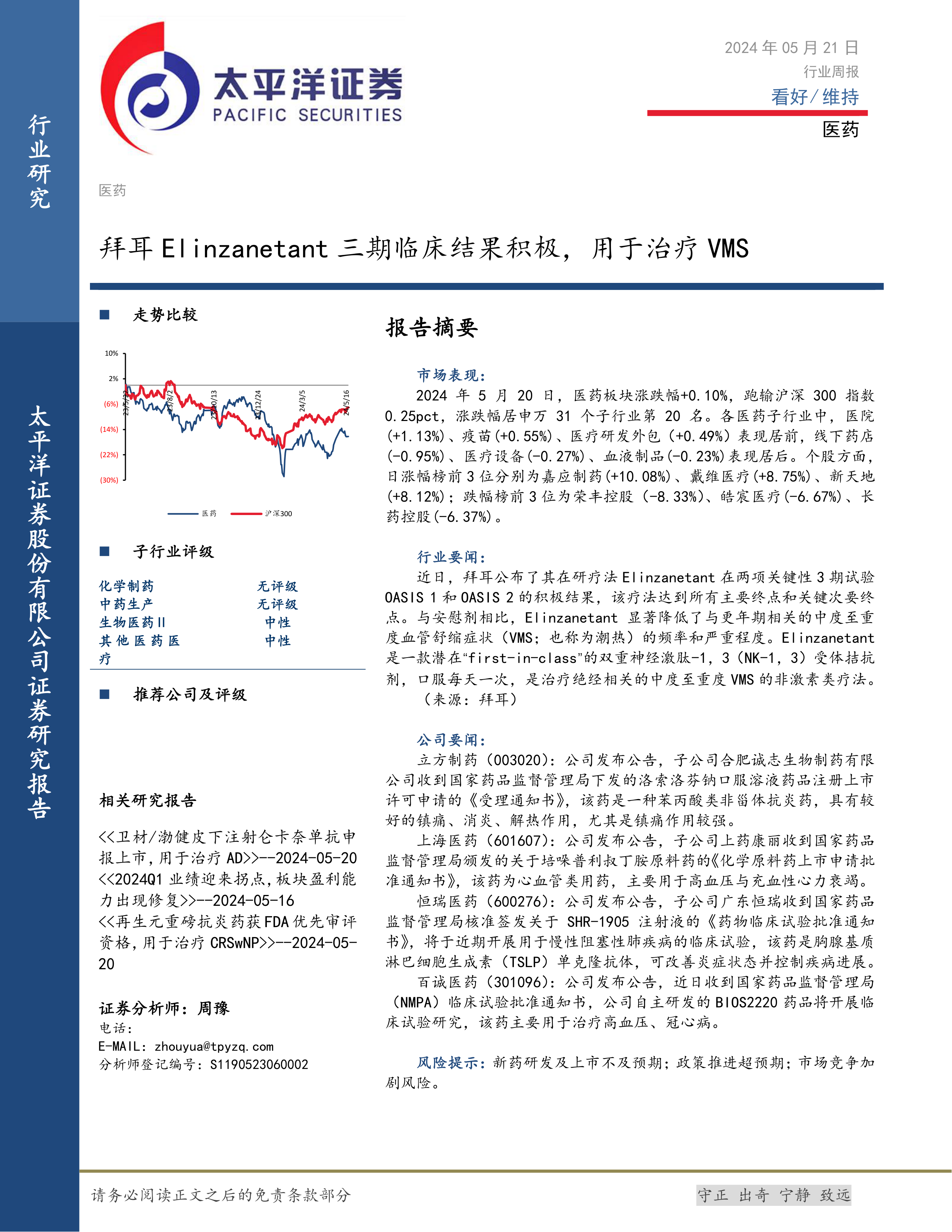 本报告对2024年5月21日医药行业进行了简要分析,指出行业整体表现平稳,但细分领域存在差异化发展。拜耳Elinzanetant三期临床试验的积极结果为行业带来积极预期。多家医药公司在研发和产品注册方面取得进展,体现了行业持续创新和发展的动力。 然而,报告未提供具体的投资建议,仅对市场走势和公司新闻进行了总结和分析。 投资者需结合自身情况和风险承受能力进行独立判断。