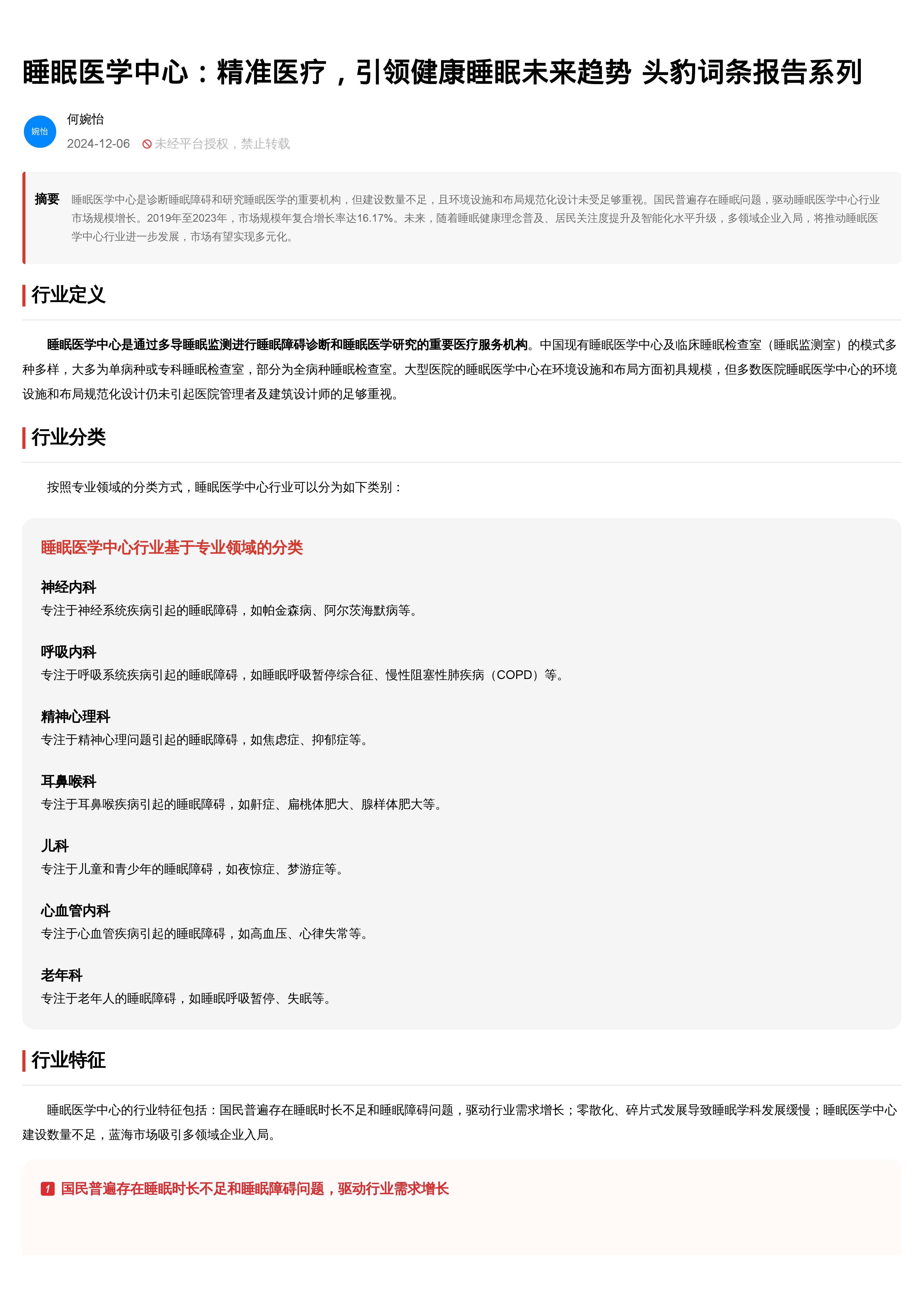 本报告围绕睡眠医学中心行业展开分析,核心观点如下:
