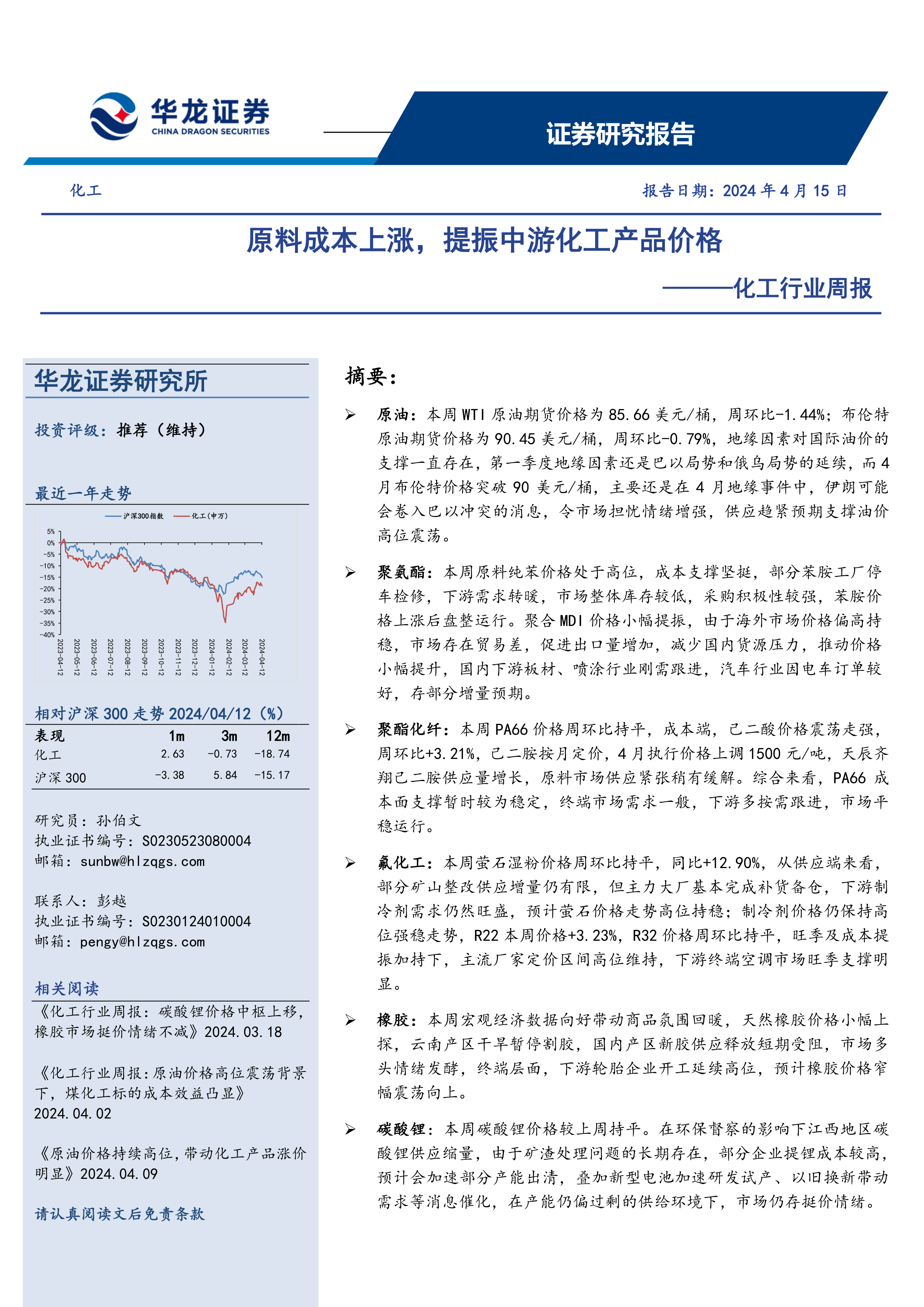 本报告基于华龙证券研究所对化工行业一周市场表现的跟踪和分析,利用统计数据和图表,对化工行业的主要产品价格走势、库存变化以及市场供需情况进行了全面的解读。报告指出,原材料成本上涨,特别是原油价格的高位震荡,对部分化工产品价格构成支撑,但整体市场表现分化。报告维持对化工行业的“推荐”评级,并提出了具体的投资建议和风险提示,为投资者提供参考。 报告中大量使用了图表数据,清晰地展现了不同化工产品价格的波动情况,以及与原油价格之间的关联性,为投资者提供了更直观的市场信息。 此外,报告还关注了宏观经济政策和行业新闻对化工行业的影响,体现了对市场全面的分析视角。
