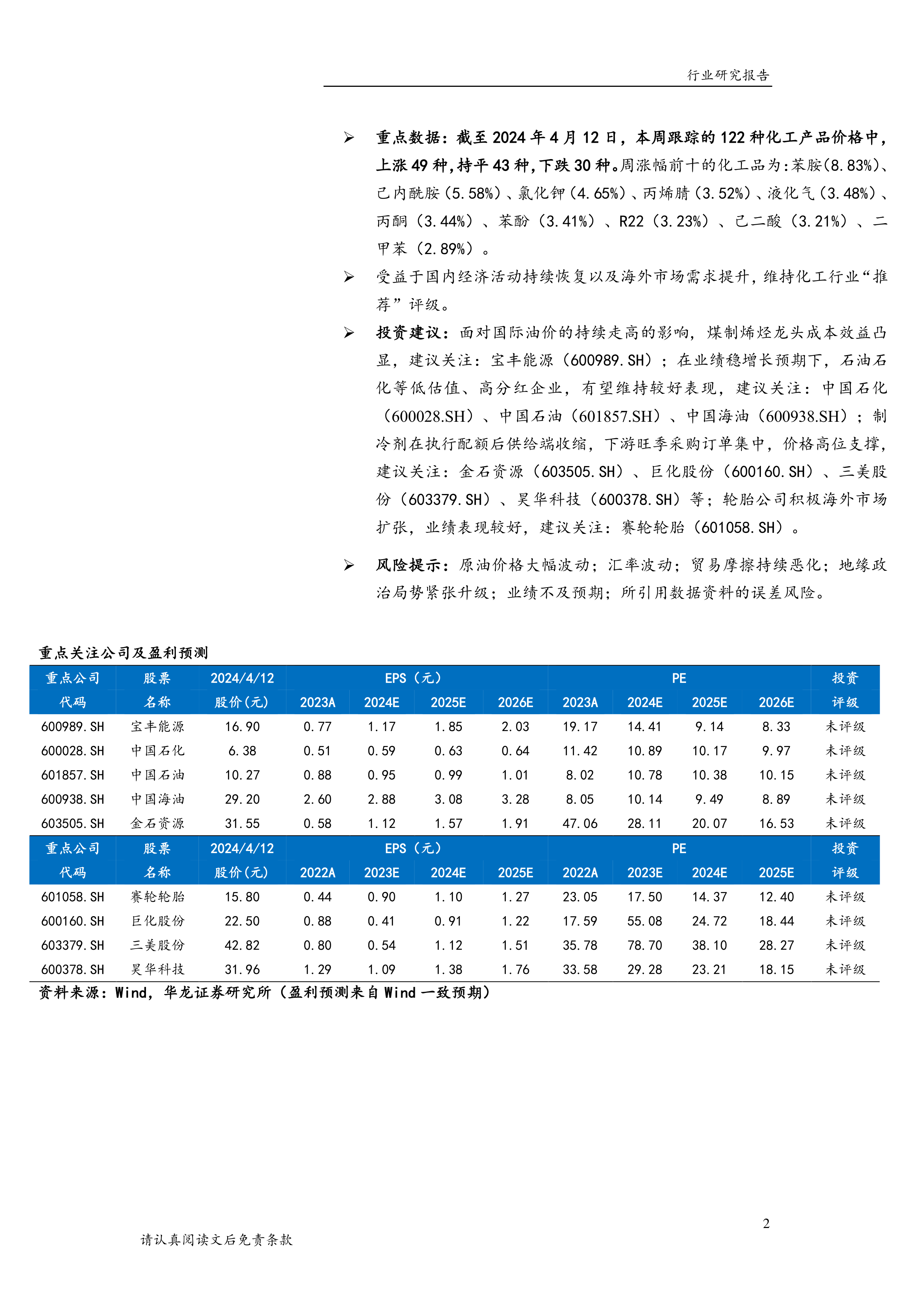 本报告的核心观点是:原材料成本上涨,特别是原油价格的持续高位震荡,对化工行业产品价格产生显著的提振作用。部分化工产品价格上涨,但整体市场表现分化,部分产品价格持平或下跌。华龙证券研究所维持对化工行业的“推荐”评级,并建议关注煤制烯烃龙头、低估值高分红石油石化企业、制冷剂相关企业以及积极拓展海外市场的轮胎公司。