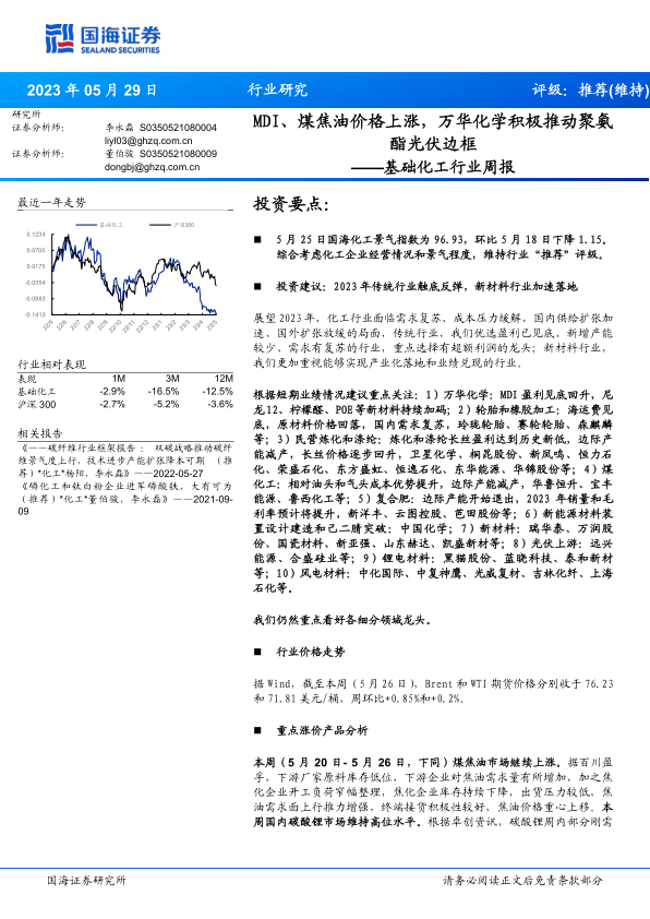 基础化工行业周报:MDI、煤焦油价格上涨,万华化学积极推动聚氨酯光伏边框