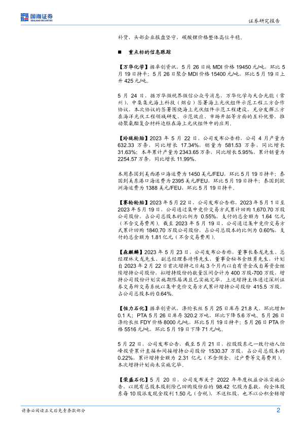 报告对万华化学、玲珑轮胎、赛轮轮胎、森麒麟、恒力石化、荣盛石化、东方盛虹、恒逸石化、桐昆股份、卫星化学、新凤鸣、新洋丰、云图控股、中国化学、龙佰集团、阳谷华泰、国瓷材料、华峰化学、新和成、三友化工、华鲁恒升、宝丰能源、金禾实业、瑞华泰、赞宇科技、国光股份、海利尔、广信股份、三棵树、金发科技、道恩股份、万润股份、利安隆、山东赫达、新亚强、凯盛新材、粤桂股份、中化国际、楚江新材、齐翔腾达、蓝晓科技、盐湖股份等多家重点公司的近期动态进行了跟踪,包括产品价格、产量、销量、库存、投资项目进展、资本运作等方面,并结合公司基本面和行业发展趋势,对这些公司的未来发展前景进行了分析和预测。 报告还提供了这些重点公司的股票代码、股价、2022年及2023年、2024年预期每股收益(EPS)和市盈率(PE)等关键财务数据。