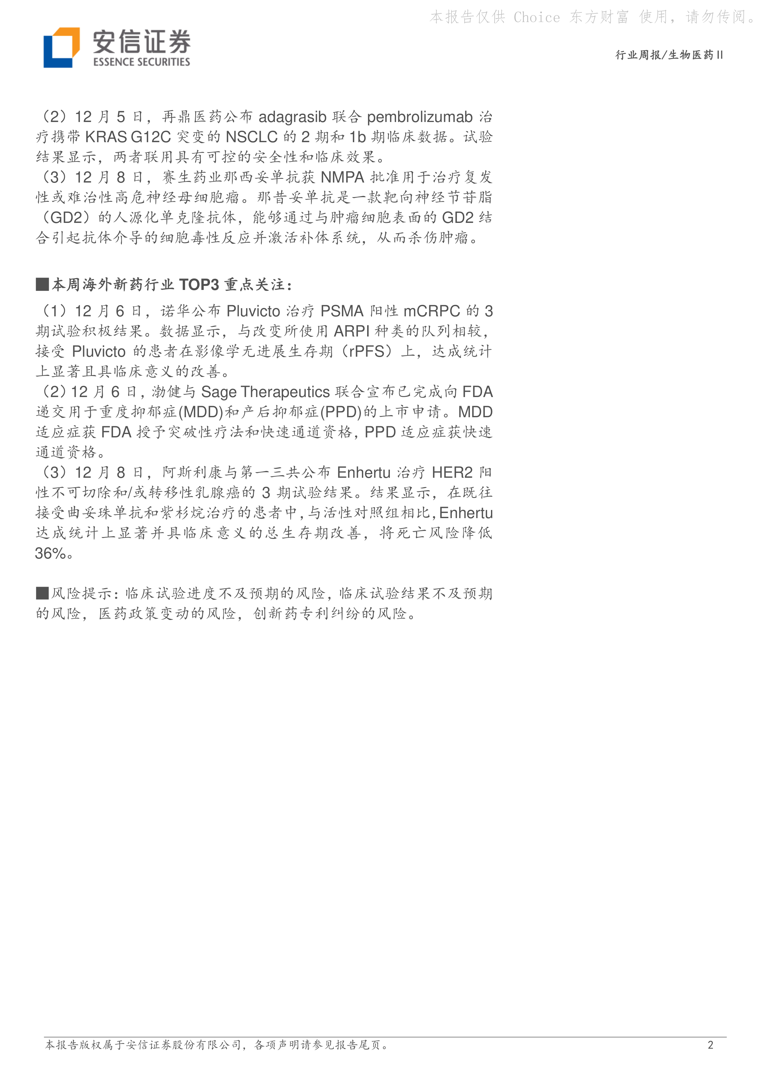 本报告对2022年12月5日至9日生物医药Ⅱ板块的市场行情、新药研发进展以及相关政策进行了全面分析。熊去氧胆酸在新冠防治中的潜在作用、国内外多家药企的新药研发进展以及潜在的市场机遇是本报告的重点内容。 报告同时指出了临床试验进度不及预期、临床试验结果不及预期、医药政策变动以及创新药专利纠纷等风险,提醒投资者谨慎投资。 报告中提供的图表和数据为投资者提供了更直观的市场信息和更专业的分析依据。 需要注意的是,本报告仅供Choice东方财富使用,请勿传阅。