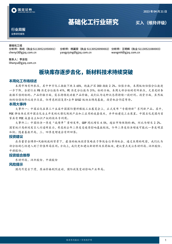 基础化工行业周报:板块库存逐步去化,新材料技术持续突破