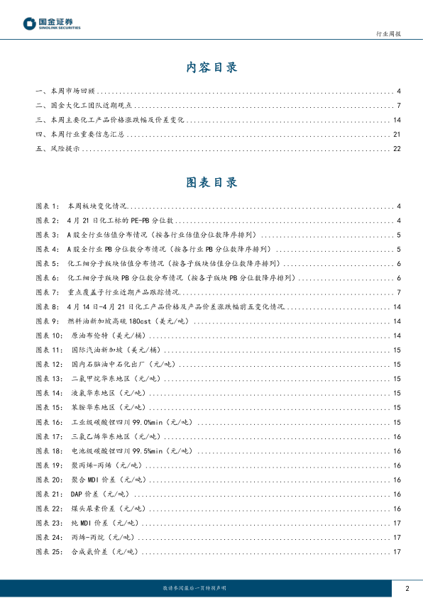 本周化工市场整体承压,虽然申万化工指数跑赢沪深300指数,但板块估值进一步下降,大部分标的承压,尤其财务数据不佳的标的。需求持续扰动产品价格,短期内投资机会仍需等待。报告对主要化工产品价格、价差变化、以及多家化工企业的市场表现进行了详细分析,并总结了本周化工行业的重要信息和投资风险。建议投资者关注新材料及农药板块部分价值标的,并降低仓位,等待更明确的投资机会。 报告中大量图表数据提供了对市场现状和未来走势的更深入的理解。
