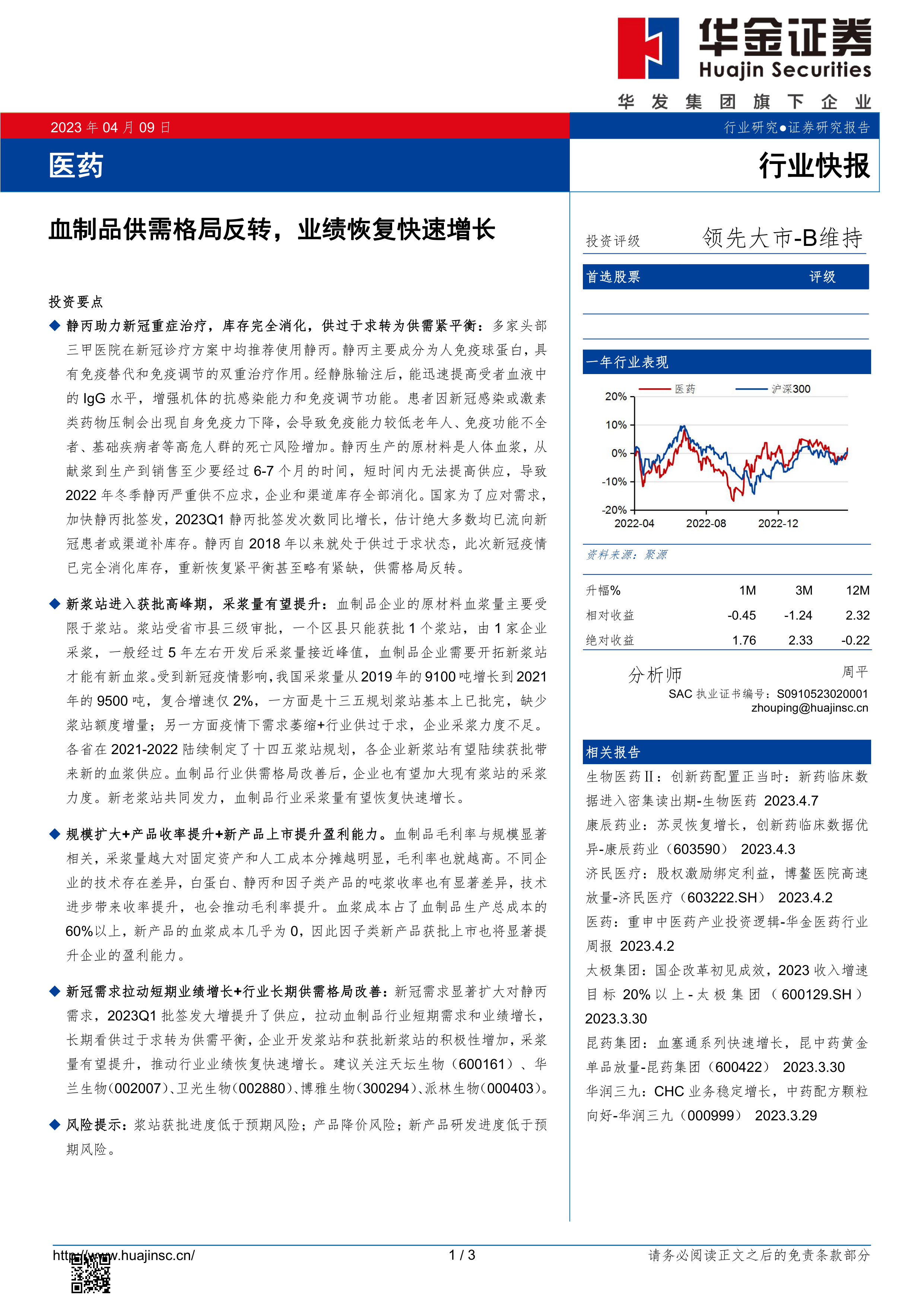 新冠需求拉动短期业绩增长+行业长期供需格局改善:新冠需求显著扩大对静丙需求,2023Q1批签发大增提升了供应,拉动血制品行业短期需求和业绩增长,长期看供过于求转为供需平衡,企业开发浆站和获批新浆站的积极性增加,采浆量有望提升,推动行业业绩恢复快速增长。建议关注天坛生物(600161)、华兰生物(002007)、卫光生物(002880)、博雅生物(300294)、派林生物(000403)。