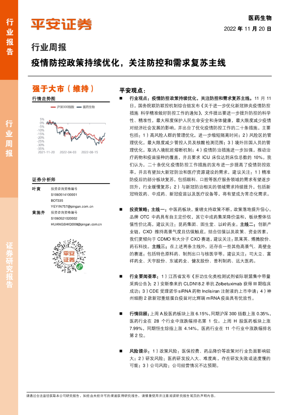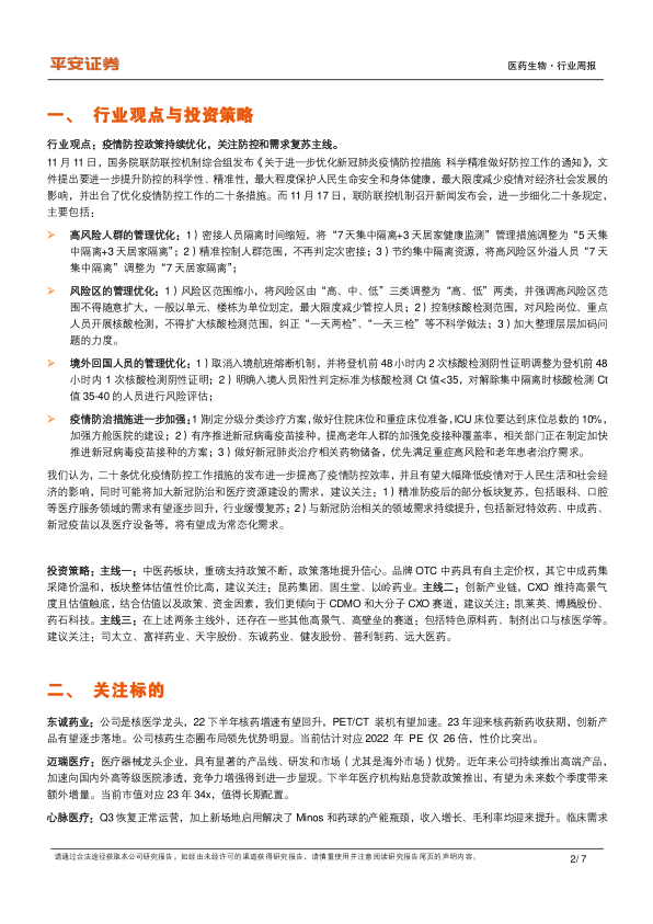 行业观点:疫情防控政策持续优化,关注防控和需求复苏主线。11 月 11日,国务院联防联控机制综合组发布《关于进一步优化新冠肺炎疫情防控措施 科学精准做好防控工作的通知》,文件提出要进一步提升防控的科学性、精准性,最大程度保护人民生命安全和身体健康,最大限度减少疫情对经济社会发展的影响,并出台了优化疫情防控工作的二十条措施,主要包括:1)高风险人群的管理优化,进一步缩短隔离时间;2)风险区的管理优化,最大限度减少管控人员及核酸检测范围;3)境外回国人员的管理优化,取消入境航班熔断机制;4)疫情防治措施进一步加强,推动治疗药物和疫苗接种的覆盖,并且要求 ICU 床位达到床位总数的 10%。我们认为,二十条优化疫情防控工作措施的发布进一步提高了疫情防控效率,并且有望加大新冠防治和医疗资源建设的需求,建议关注:1)精准防疫后的部分板块复苏,包括眼科、口腔等医疗服务领域的需求有望逐步回升,行业缓慢复苏;2)与新冠防治相关的领域需求持续提升,包括新冠特效药、中成药、新冠疫苗以及医疗设备等,将有望成为常态化需求。