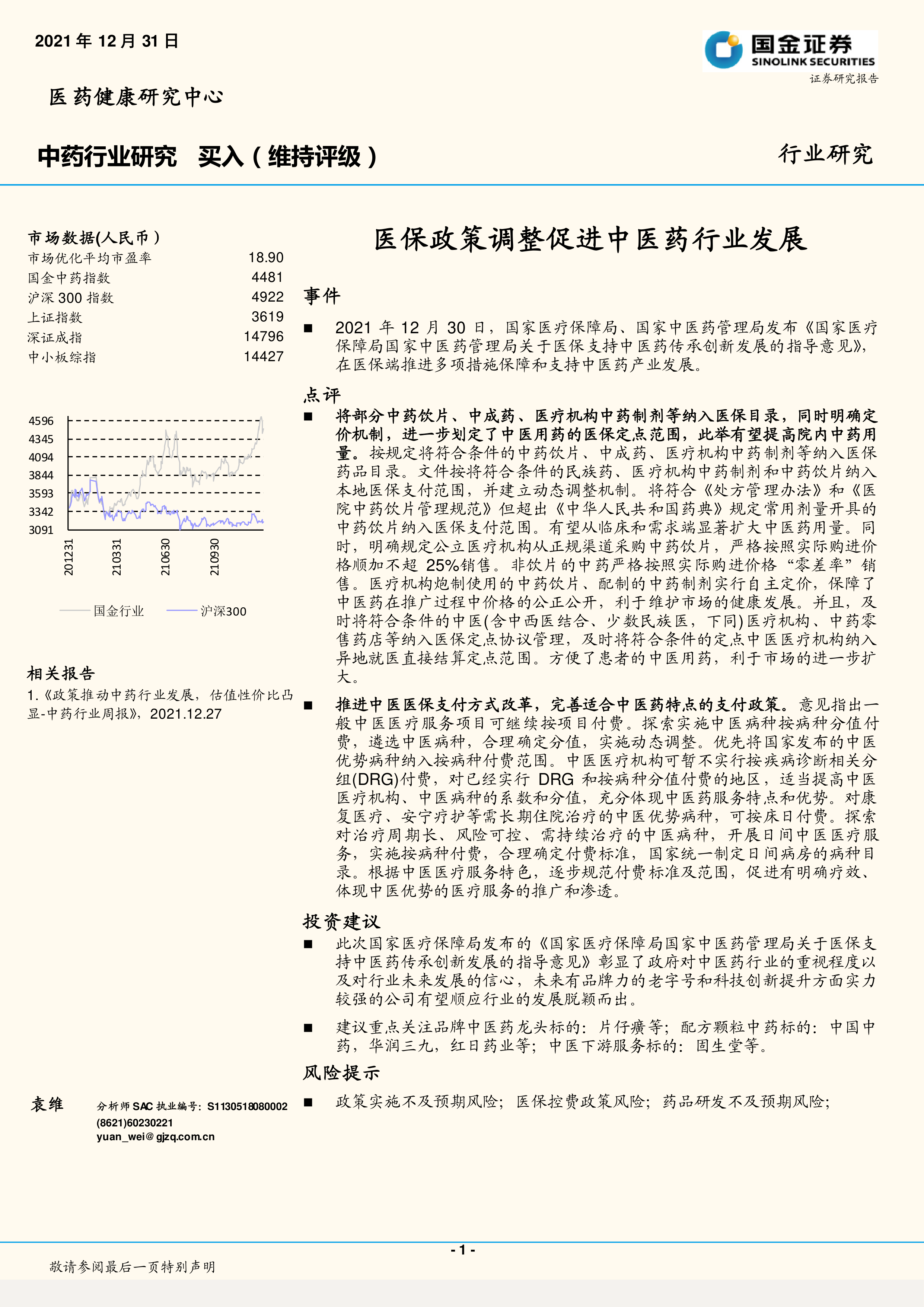 报告重点关注2021年12月30日发布的《国家医疗保障局国家中医药管理局关于医保支持中医药传承创新发展的指导意见》。该政策对中医药行业的影响主要体现在以下几个方面: