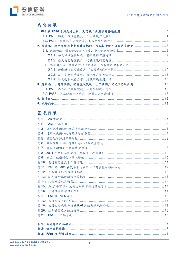 需求端:下游锦纶纤维、汽车轻量化及风电带来需求空间:民用方面,锦纶纤维作为化纤领域重要组成,未来对传统棉质面料的替代作用有望不断显现,此外随着全民对运动的关注度逐步增加,终端运动相关产品,特别是女性运动产品所面临需求的增加有望为PA6及PA66带来较大需求。而在工业用方面,未来新能源汽车快速发展有望带动汽车行业景气上行,叠加汽车轻量化及“以塑代钢”趋势逐步推进,PA下游工程塑料有望面临较大需求空间;此外在另一个新能源领域风力发电方面,PA作为热塑性树脂有望受益于其生产效率高、成本低、可多次回收利用等优势对热固性树脂形成替代,从而成为风机叶片基体树脂理想材料,未来风电行业快速发展有望为PA带来需求增量。