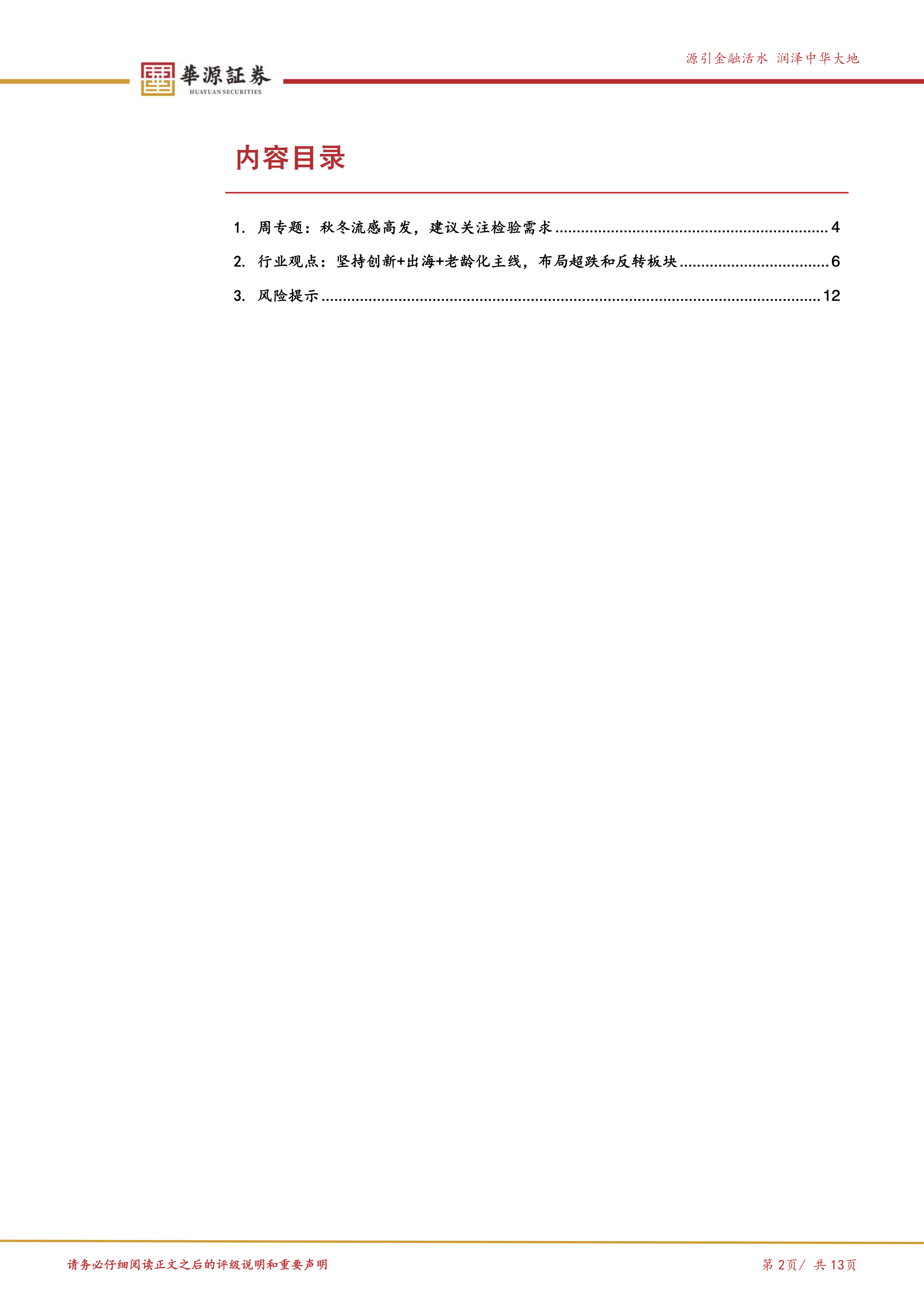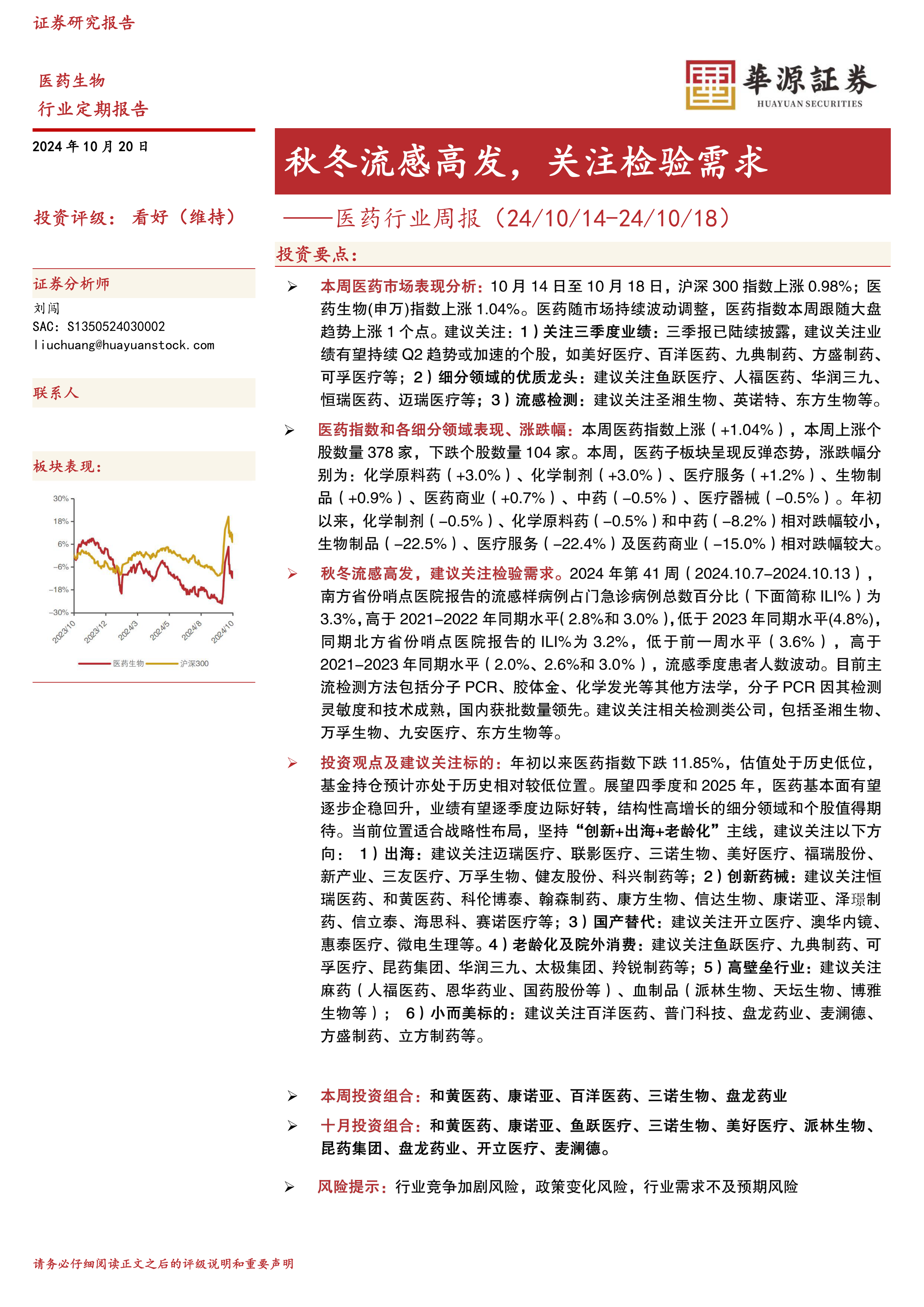 本报告的核心观点是:秋冬流感高发季来临,将带动检验需求增长,建议关注相关领域的投资机会。同时,报告维持对医药行业的看好评级,并指出应坚持“创新+出海+老龄化”的主线,布局超跌和反转板块。
