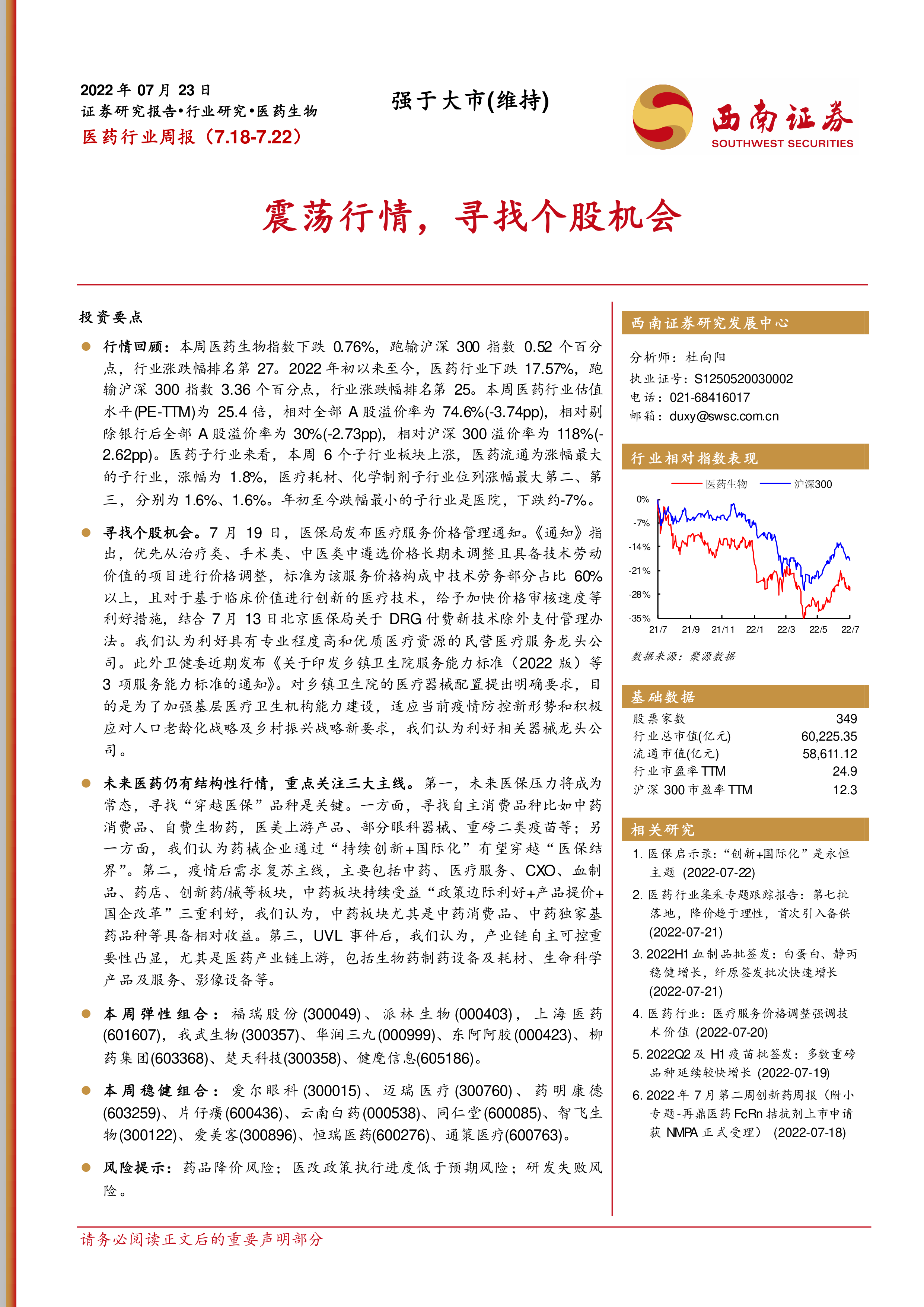 本报告对2022年7月18日至22日医药行业周度表现进行了全面分析,涵盖了行业整体表现、个股动态、政策解读、新冠疫情进展以及未来投资方向等多个方面。报告指出,尽管短期市场震荡,但医药行业长期仍存在结构性机会,建议投资者关注“穿越医保”品种、疫情后需求复苏板块以及产业链自主可控领域。报告提供的弹性组合和稳健组合个股建议,以及对重点公司的盈利预测和估值分析,为投资者提供了有价值的参考信息。 然而,投资者需注意报告中提到的药品降价风险、医改政策执行进度低于预期风险以及研发失败风险等因素。